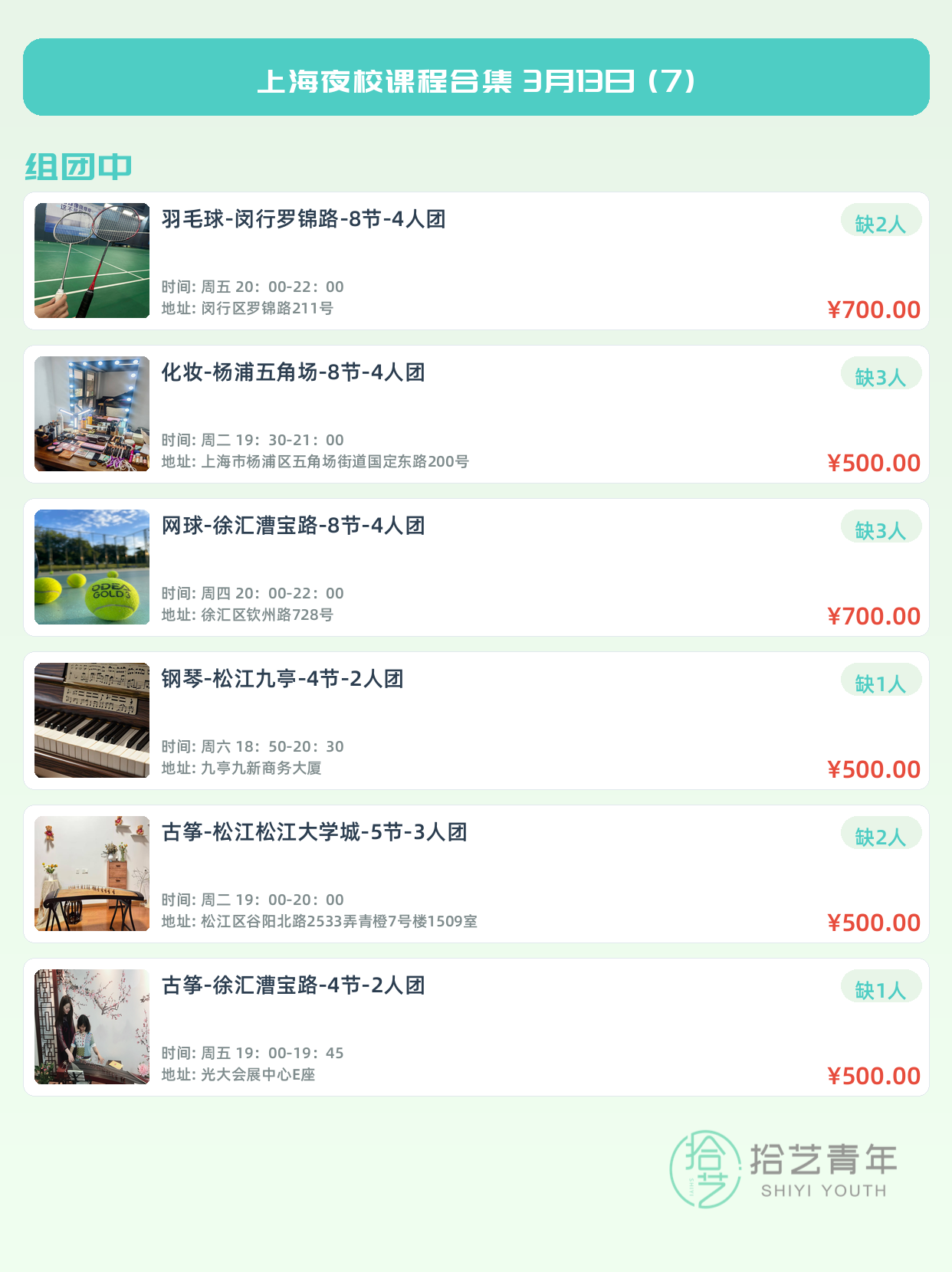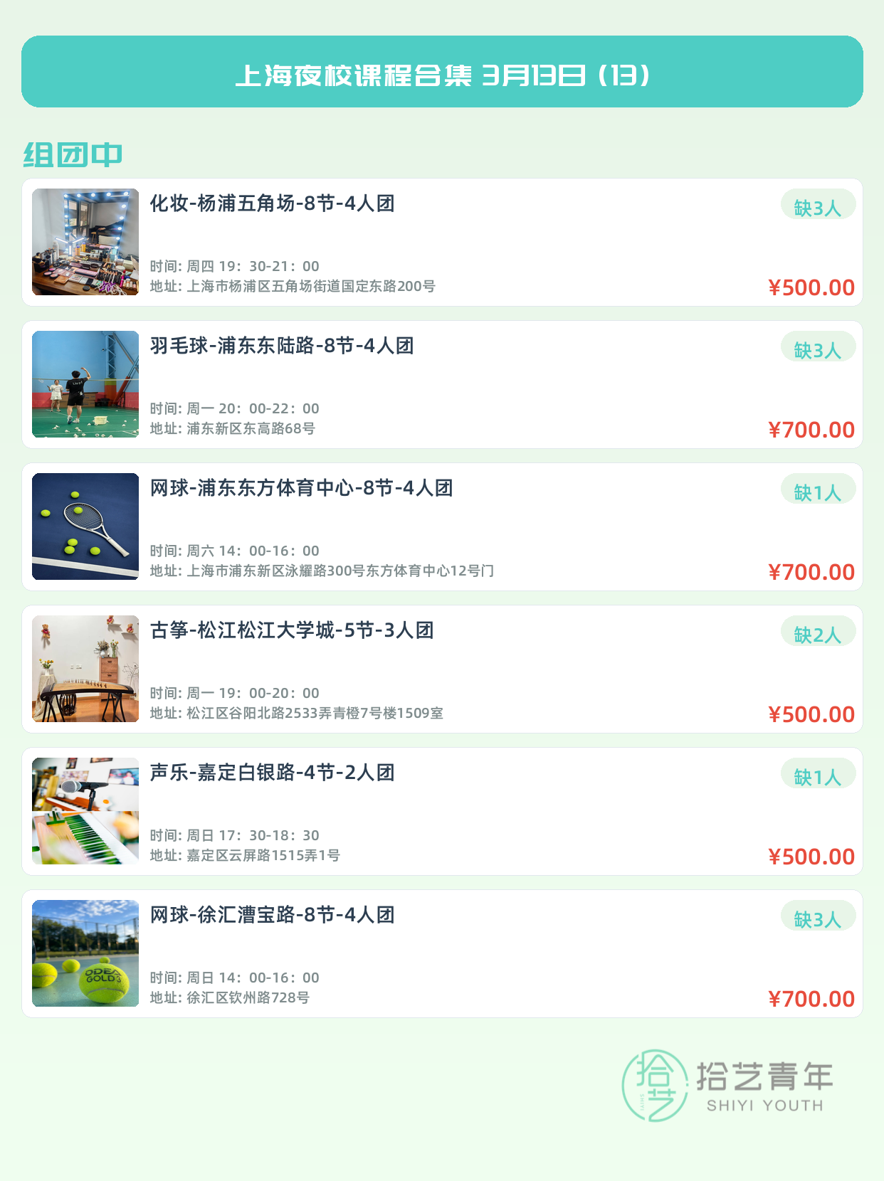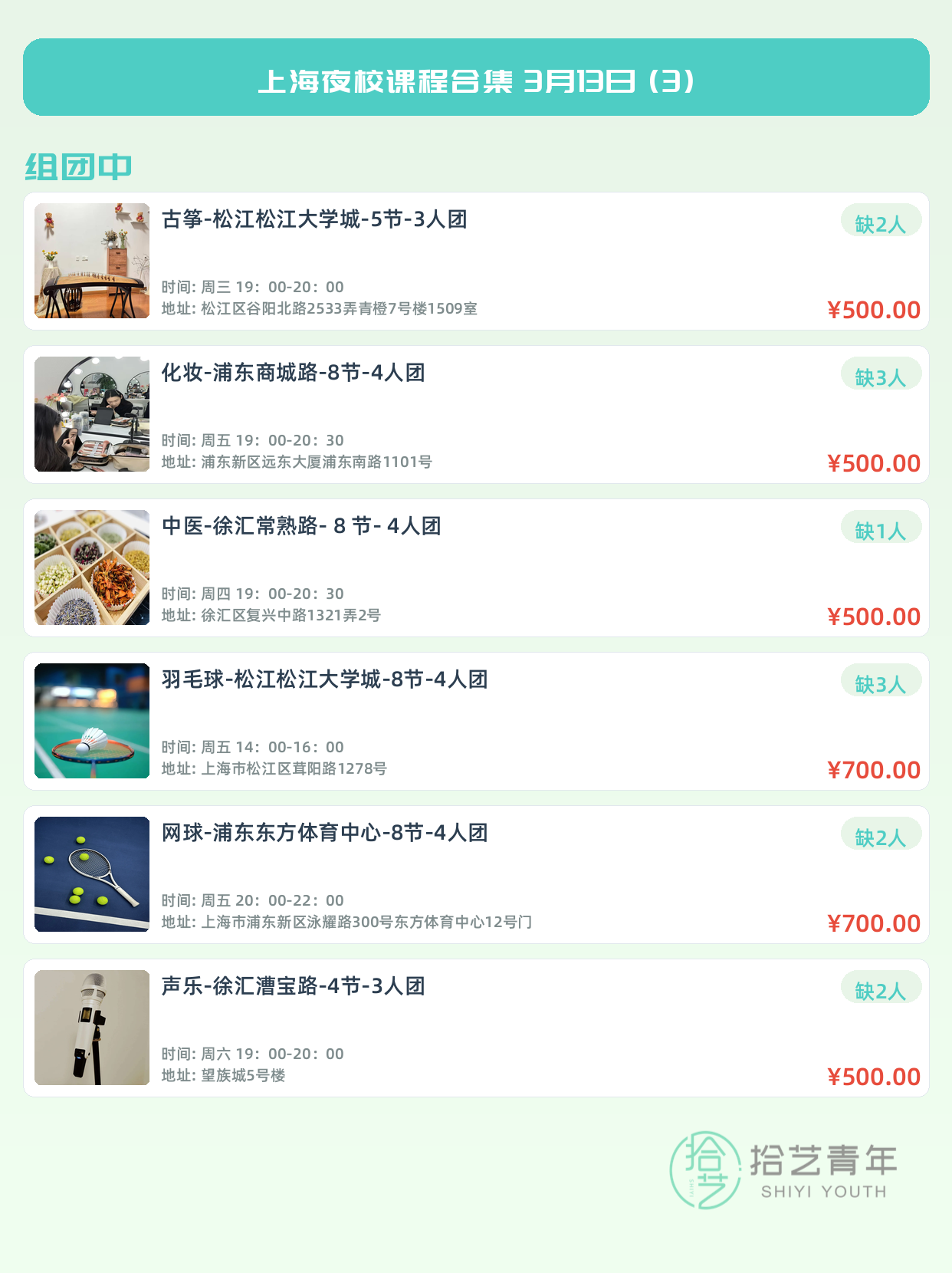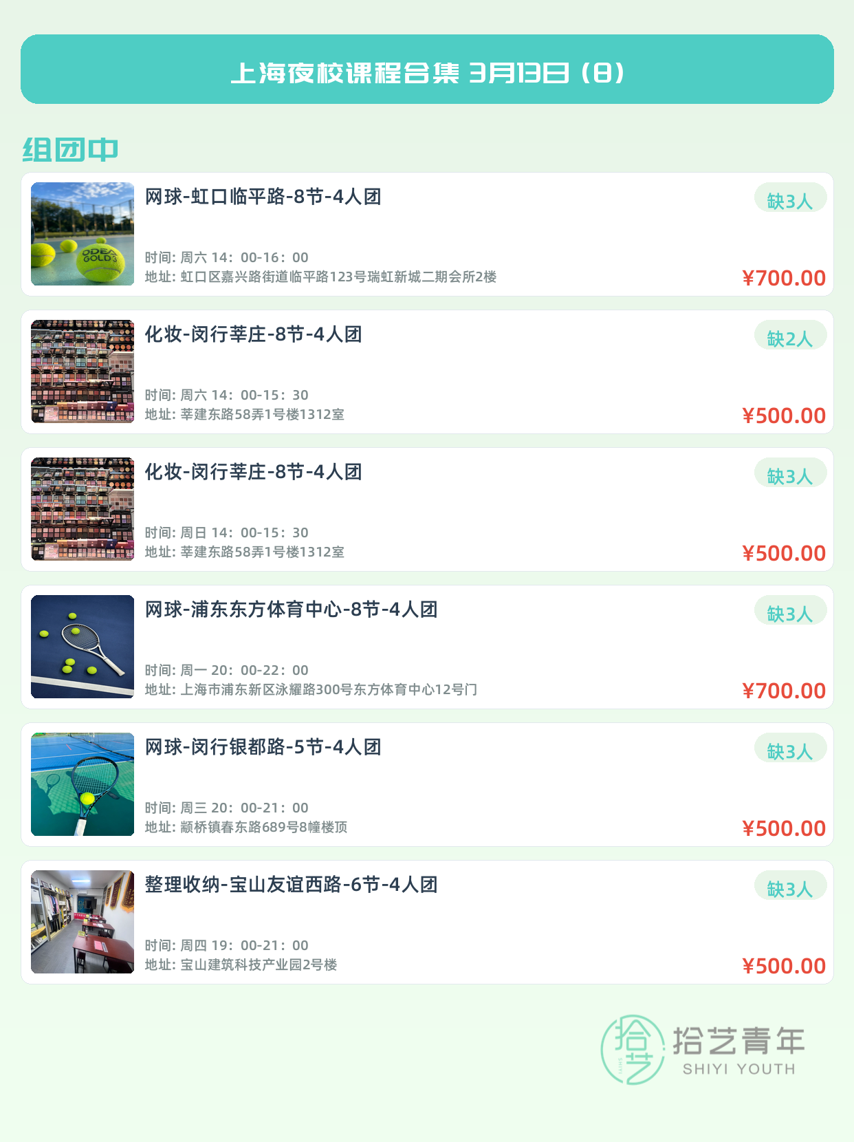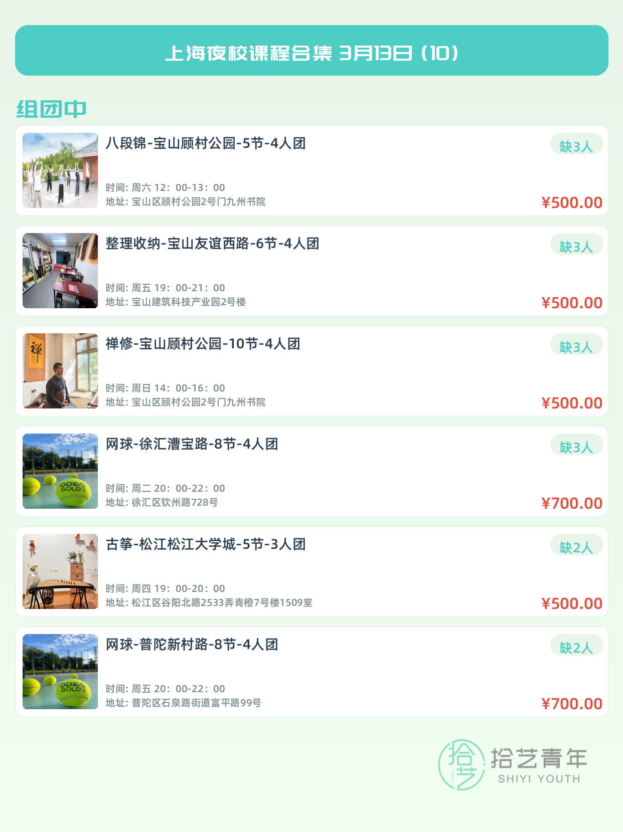 资讯>综合>正文3月13日上海夜校课程合集拾艺青年2026-03-131 / 16📊 本期课程概况• 总课程数:371门• 组团中课程:82门• 覆盖区域:15个区详见图片,欢迎报名咨询。💡 提示:以上课程信息来自拾艺青年小程序,课程可能随报名动态变化,具体以小程序实时信息为准。👉 微信小程序链接:#小程序://拾艺青年/WmfwH22mnQUxZwb