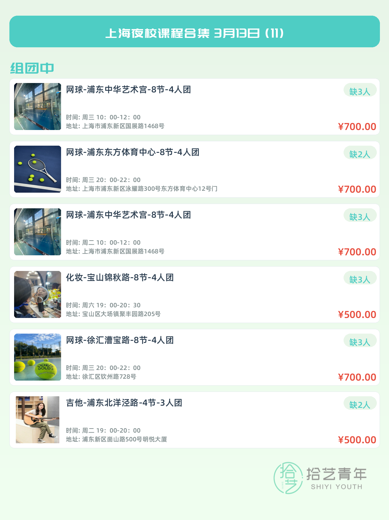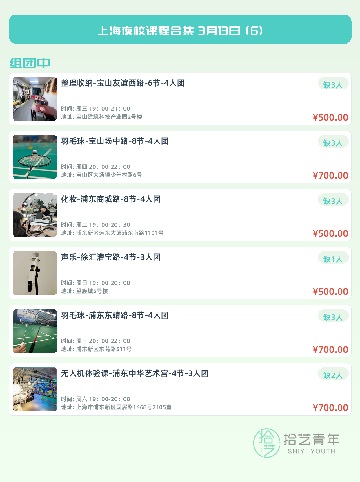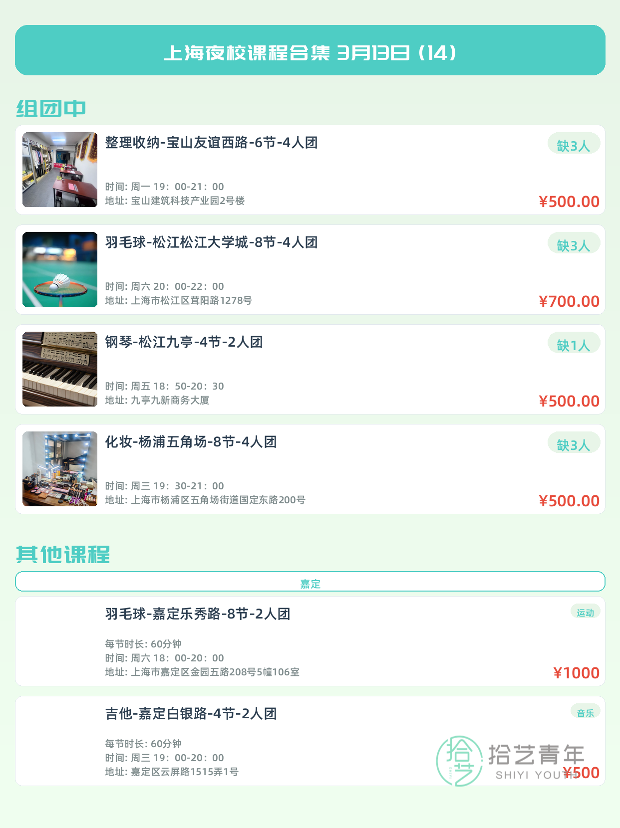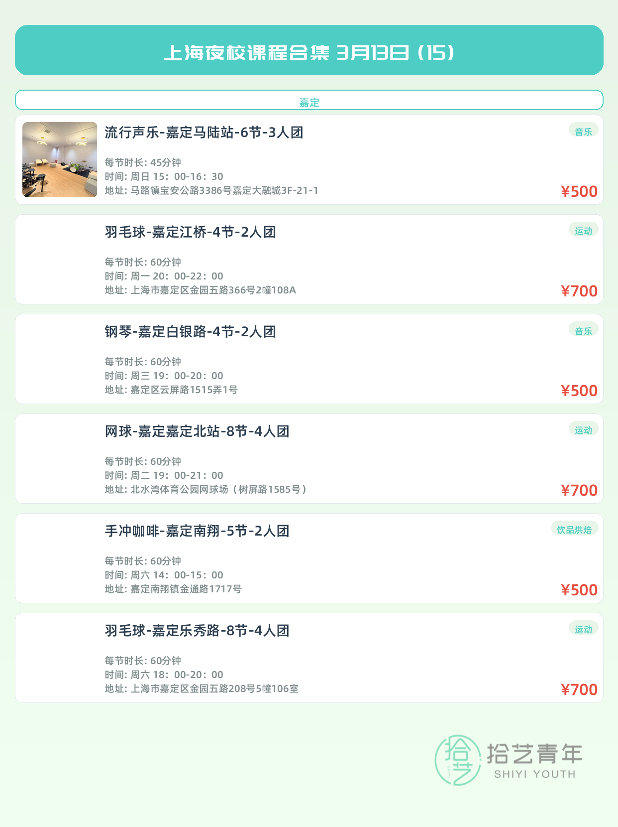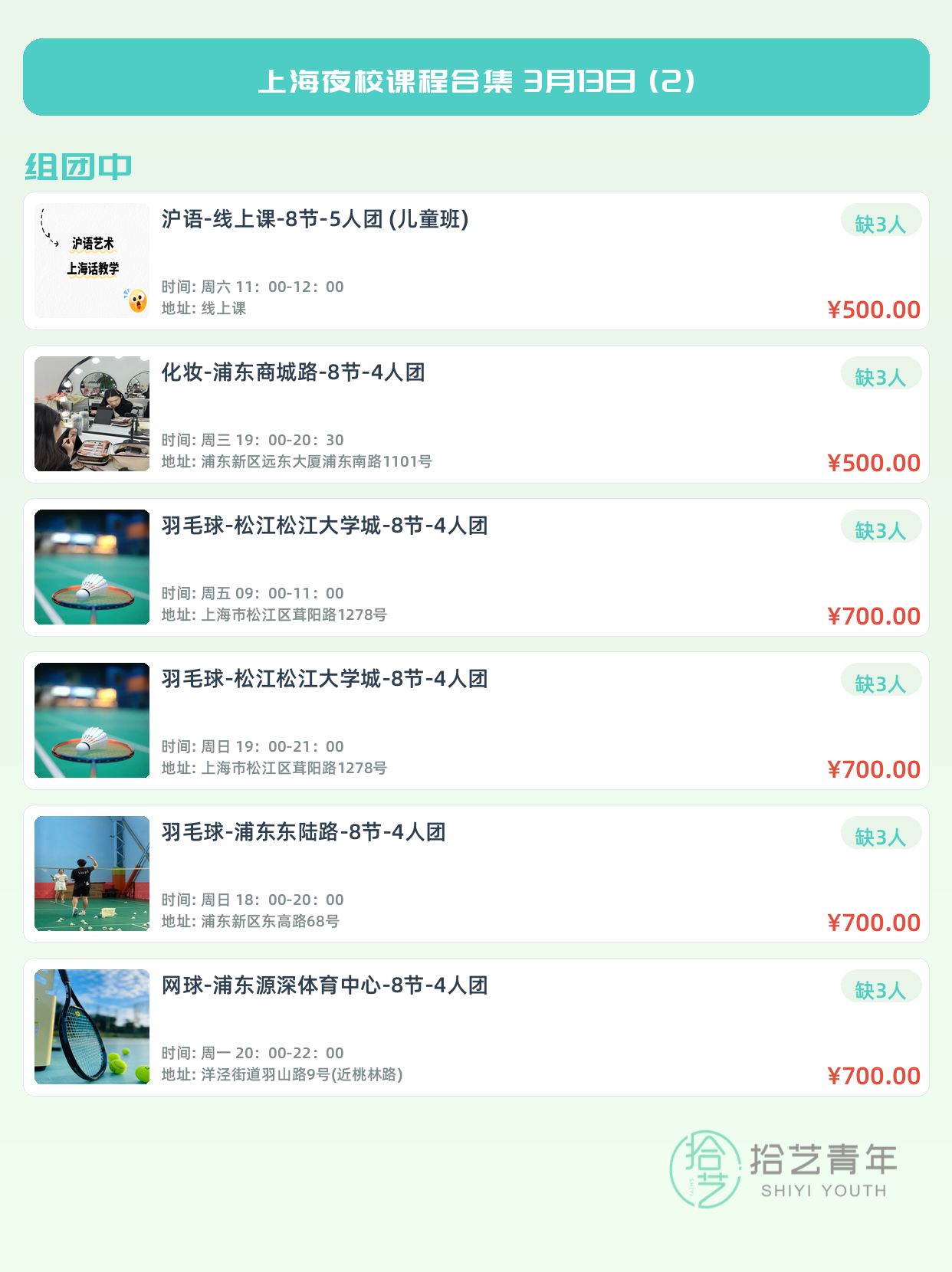资讯>综合>正文3月13日上海夜校课程合集拾艺青年2026-03-131 / 16📊 本期课程概况• 总课程数:371门• 组团中课程:82门• 覆盖区域:15个区详见图片,欢迎报名咨询。💡 提示:以上课程信息来自拾艺青年小程序,课程可能随报名动态变化,具体以小程序实时信息为准。👉 微信小程序链接:#小程序://拾艺青年/WmfwH22mnQUxZwb