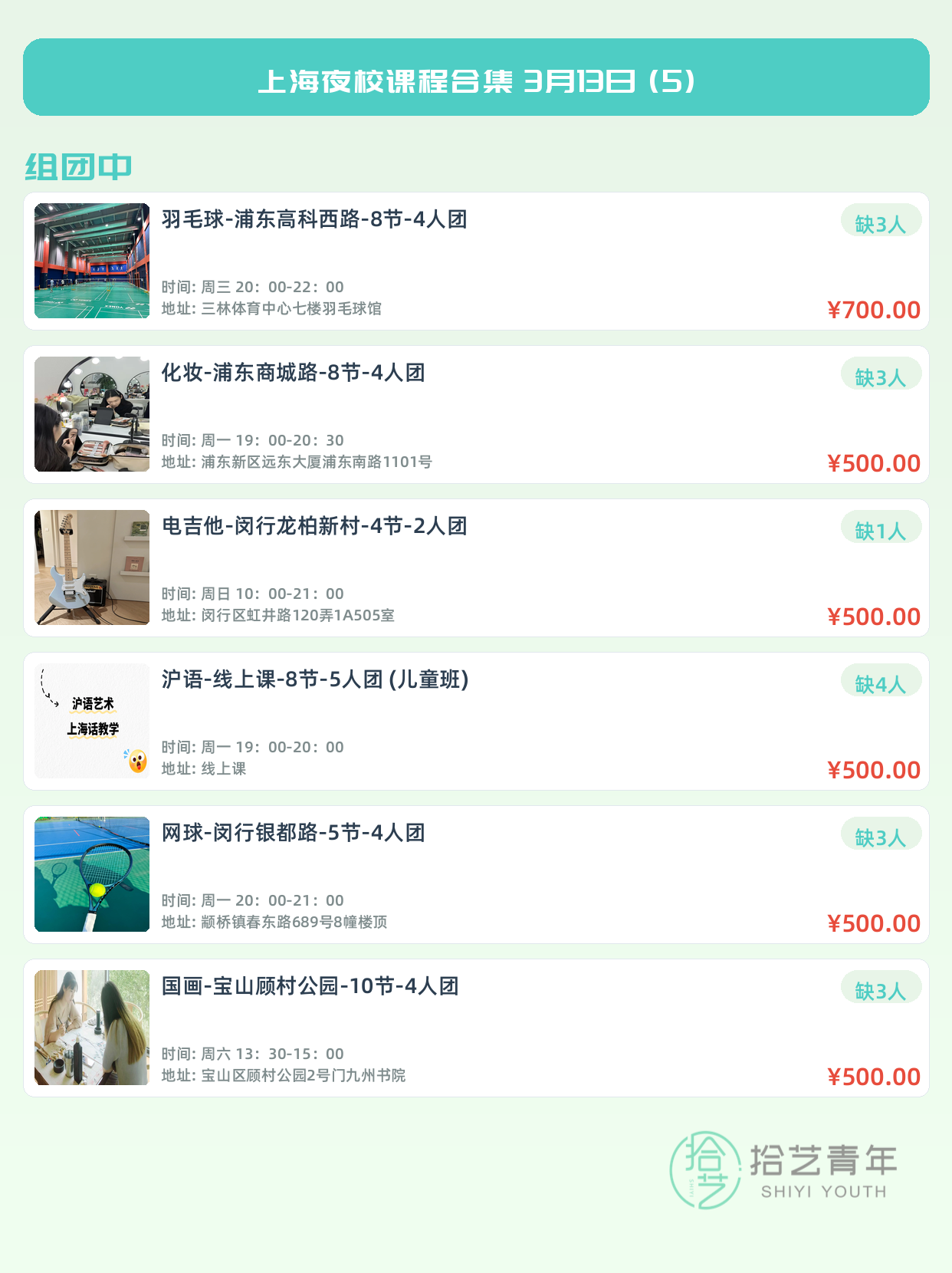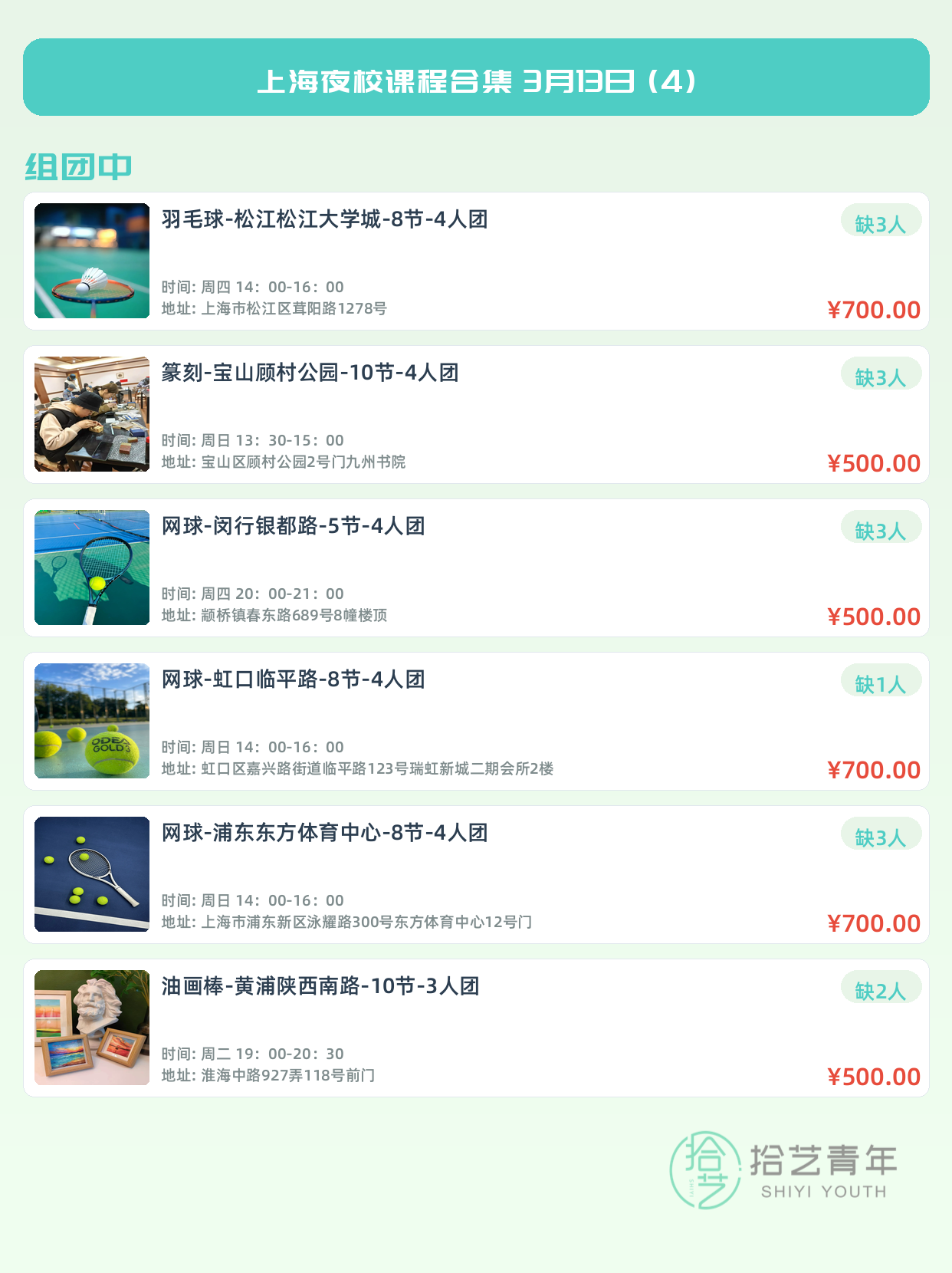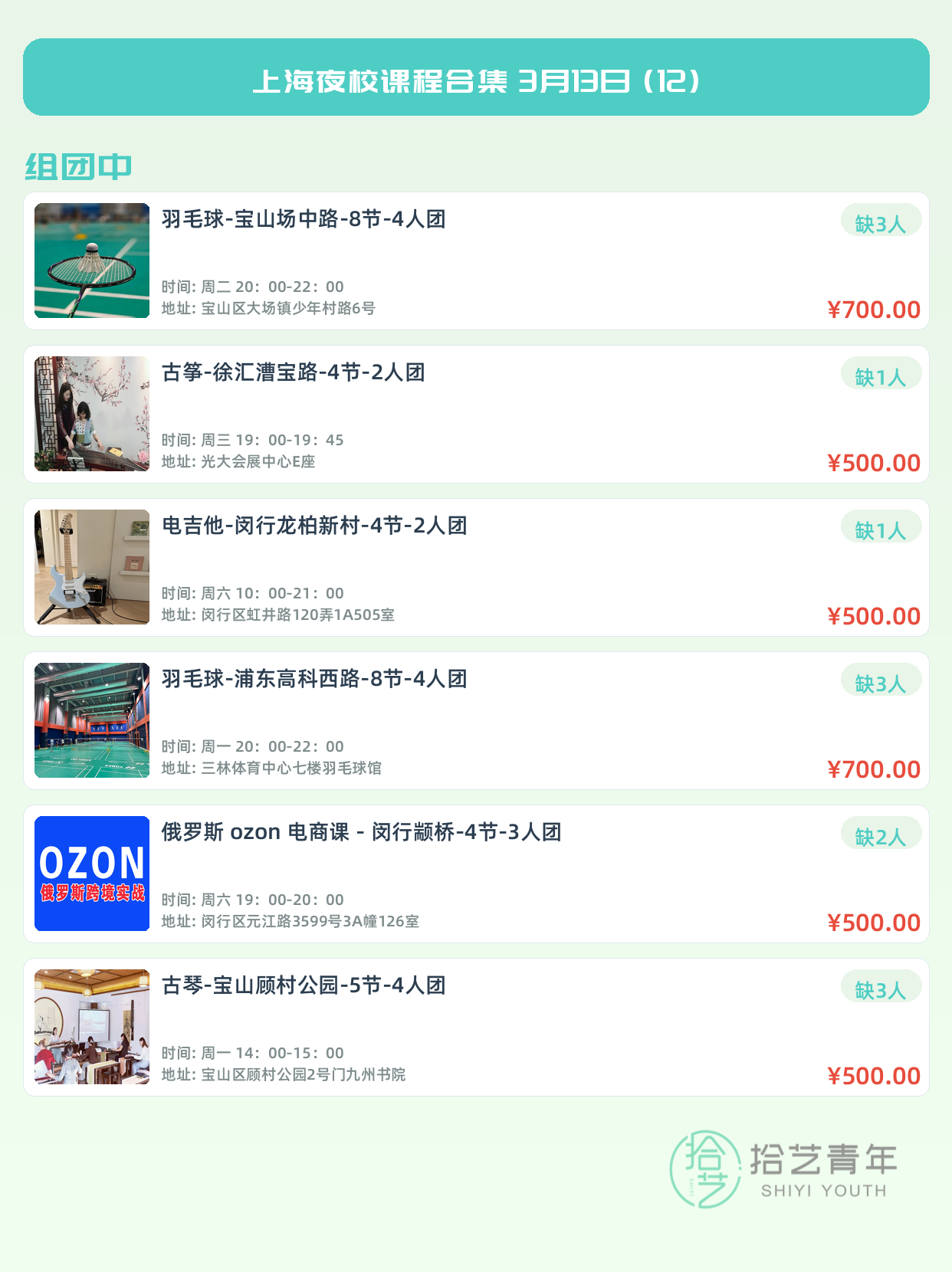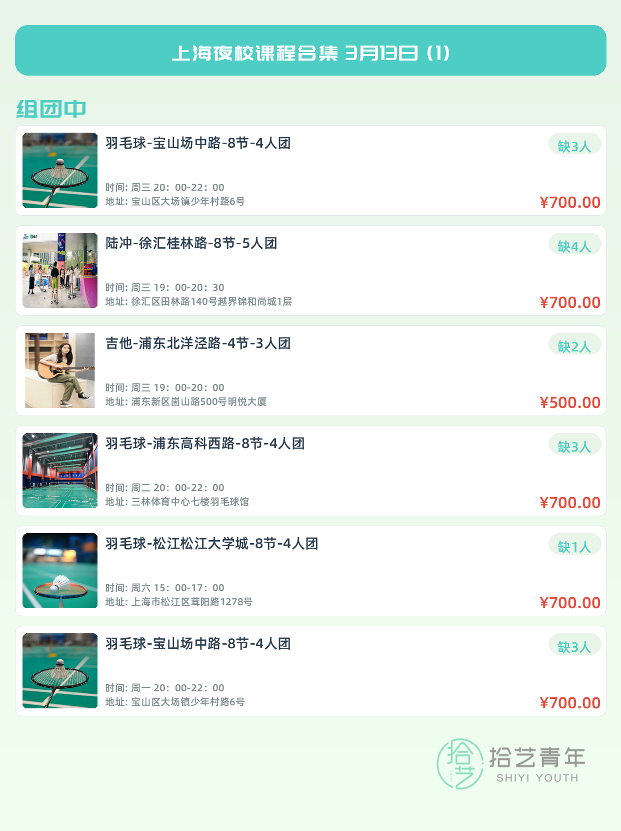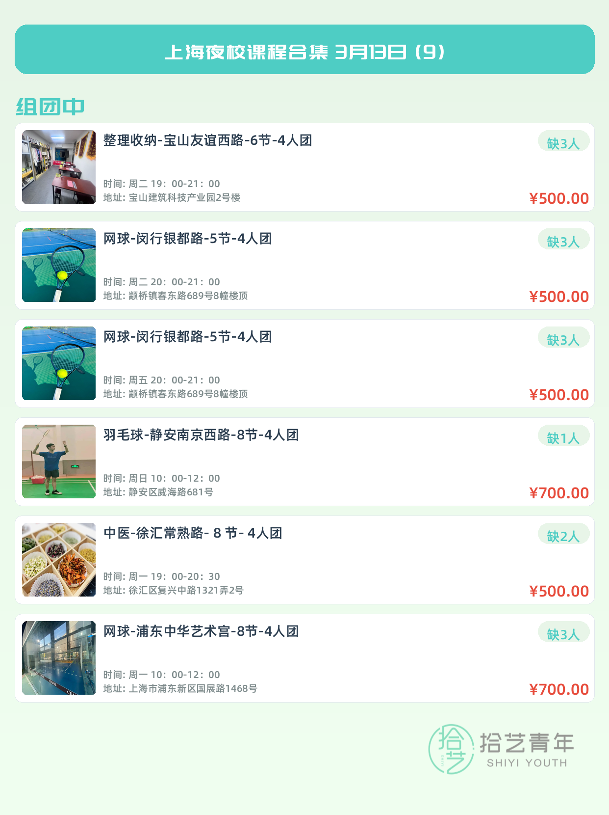 资讯>综合>正文3月13日上海夜校课程合集拾艺青年2026-03-131 / 16📊 本期课程概况• 总课程数:371门• 组团中课程:82门• 覆盖区域:15个区详见图片,欢迎报名咨询。💡 提示:以上课程信息来自拾艺青年小程序,课程可能随报名动态变化,具体以小程序实时信息为准。👉 微信小程序链接:#小程序://拾艺青年/WmfwH22mnQUxZwb