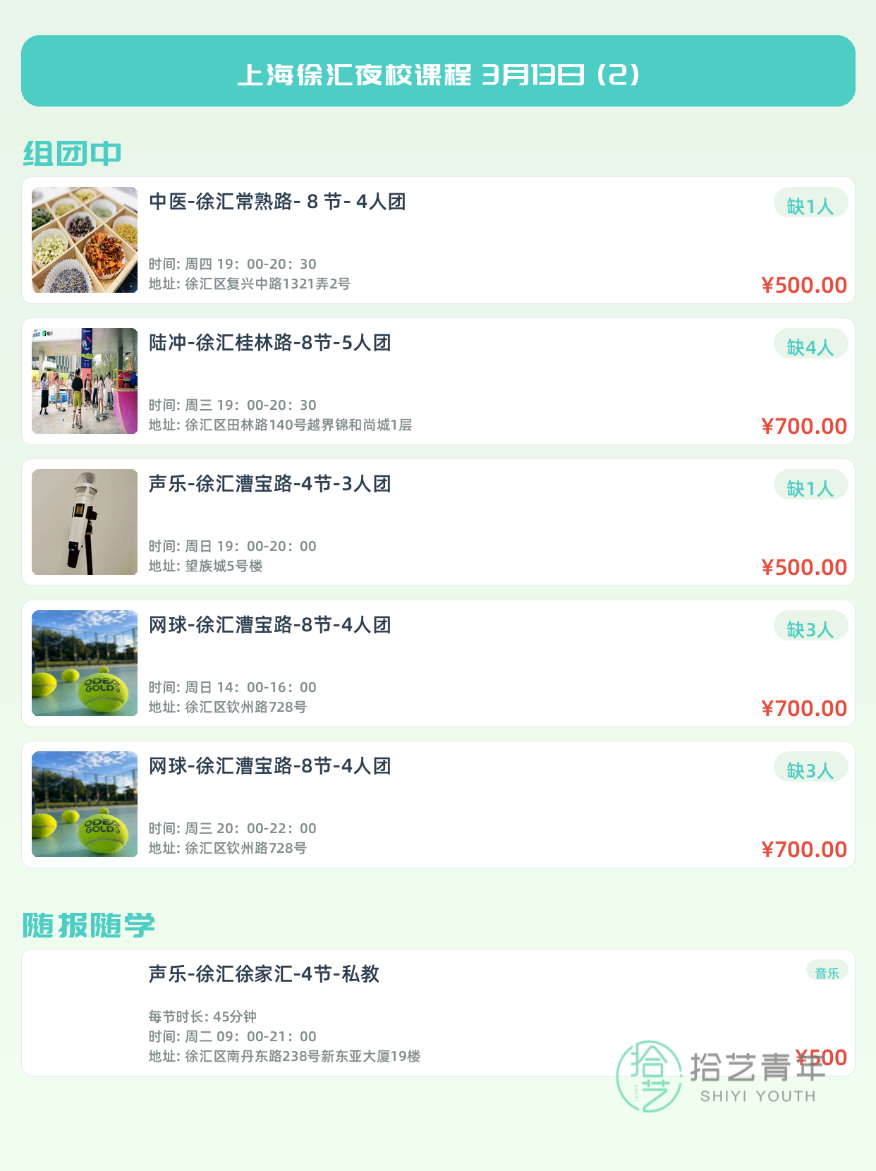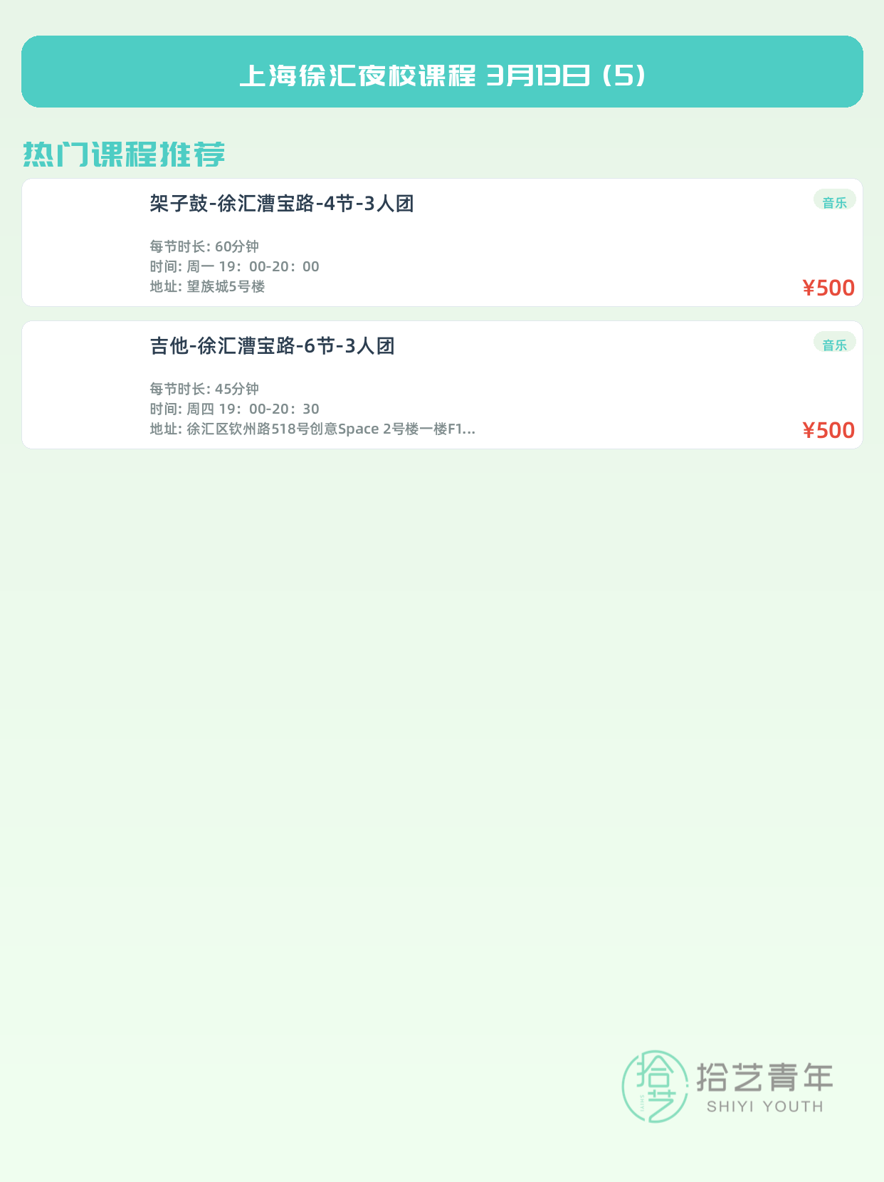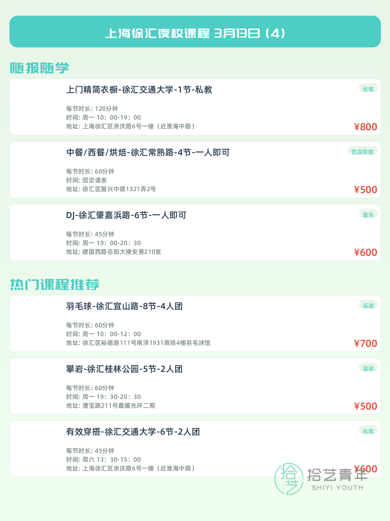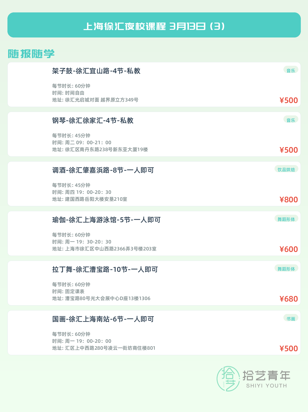 💡 提示:以上课程信息来自拾艺青年小程序,课程可能随报名动态变化,具体以小程序实时信息为准。