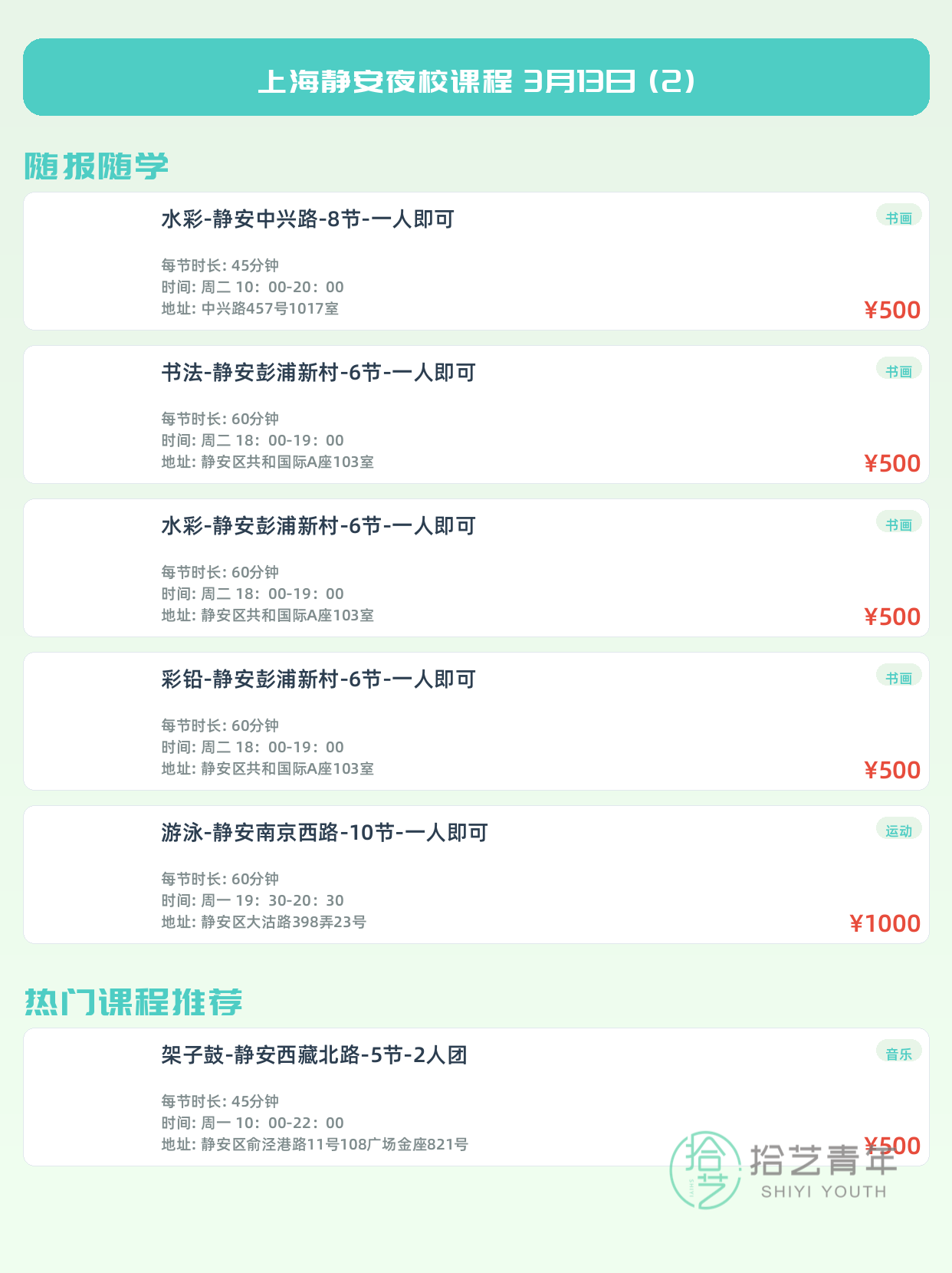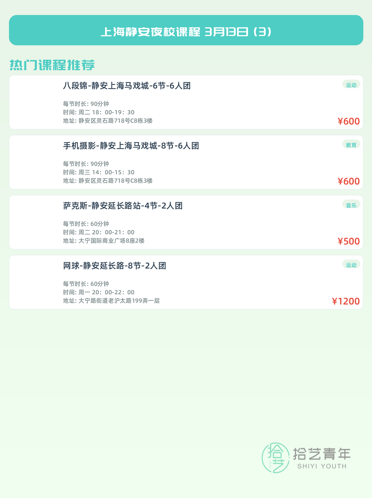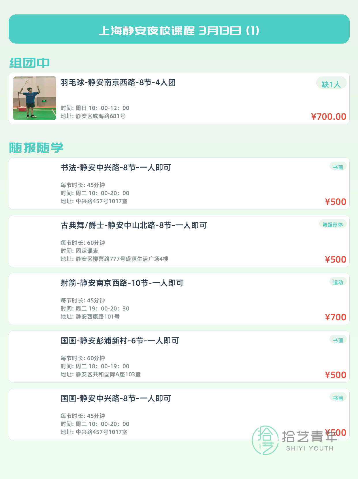 💡 提示:以上课程信息来自拾艺青年小程序,课程可能随报名动态变化,具体以小程序实时信息为准。