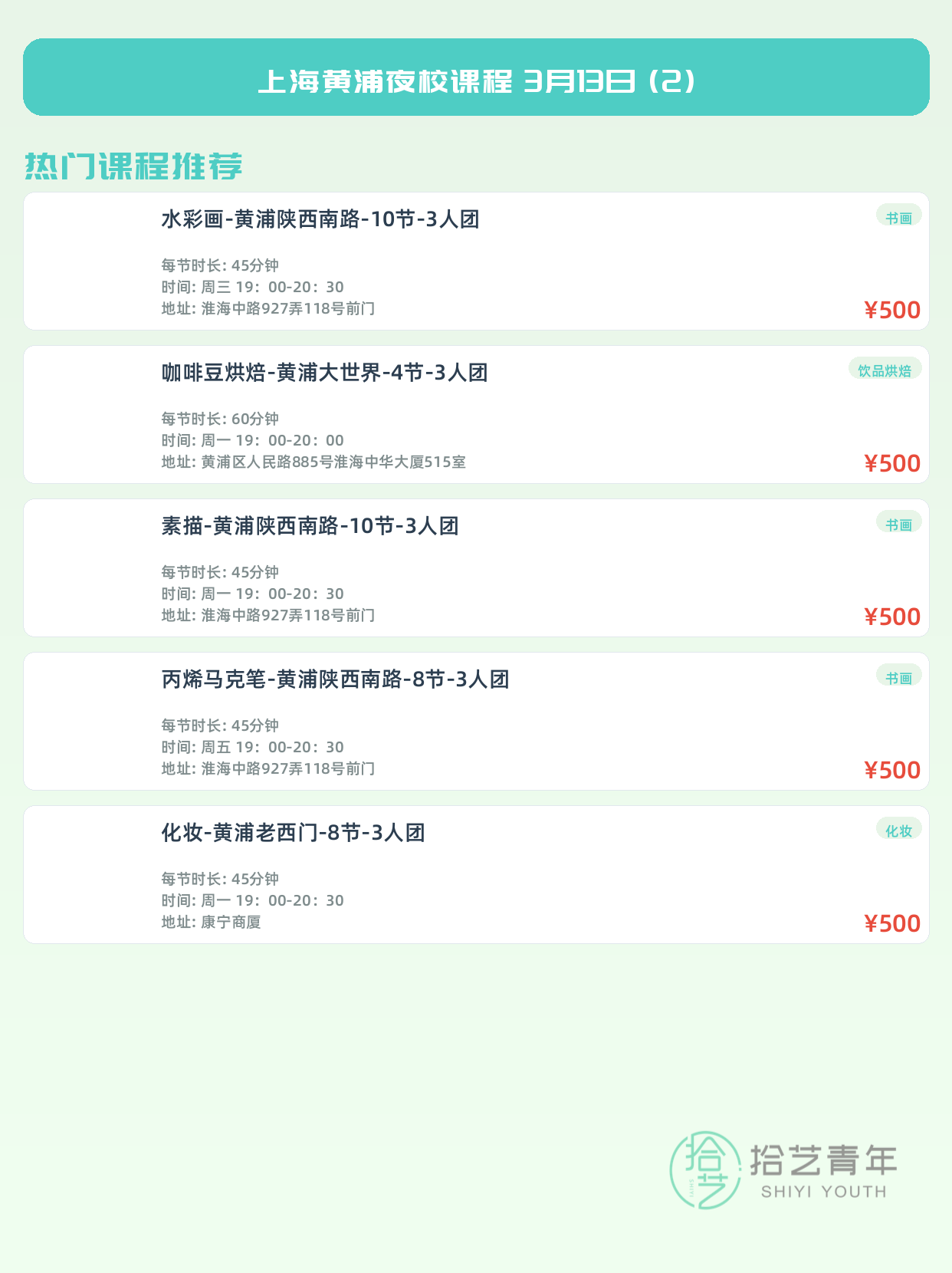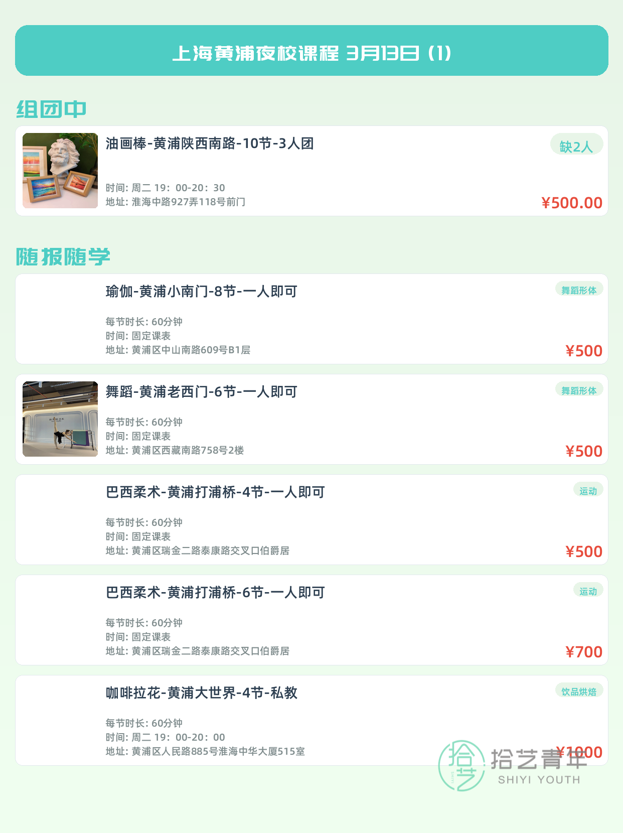 💡 提示:以上课程信息来自拾艺青年小程序,课程可能随报名动态变化,具体以小程序实时信息为准。