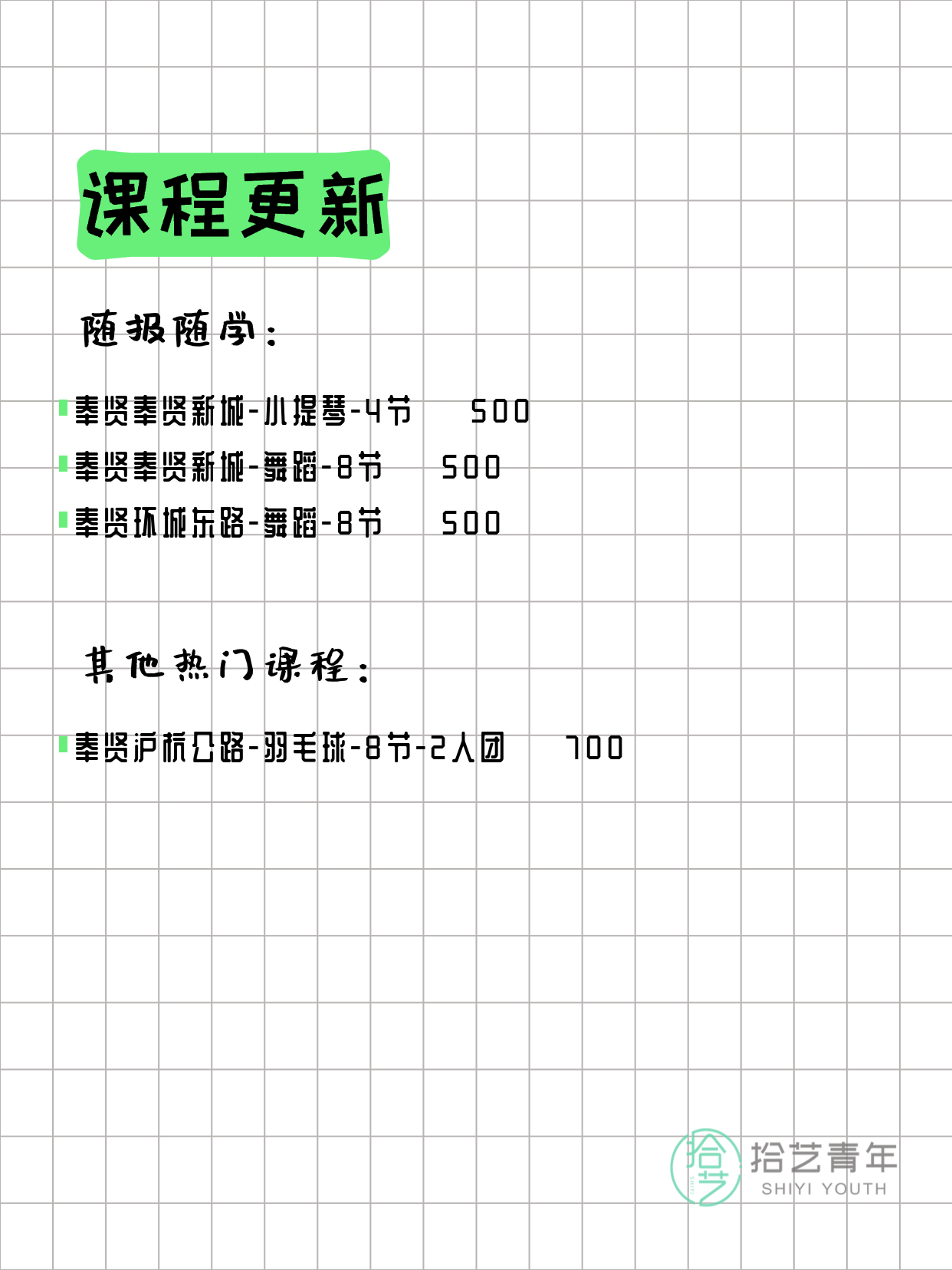 资讯>综合>正文3月13日上海奉贤夜校课程合集拾艺青年2026-03-131 / 2【随报随学】📌 舞蹈-奉贤奉贤新城-8节-一人即可📌 舞蹈-奉贤环城东路-8节-一人即可📌 小提琴-奉贤奉贤新城-4节-一人即可【热门课程推荐】⭐ 羽毛球-奉贤沪杭公路-8节-2人团详见小程序了解详细信息,欢迎报名咨询。💡 提示:以上课程信息来自拾艺青年小程序,课程可能随报名动态变化,具体以小程序实时信息为准。👉 微信小程序链接:#小程序://拾艺青年/WmfwH22mnQUxZwb