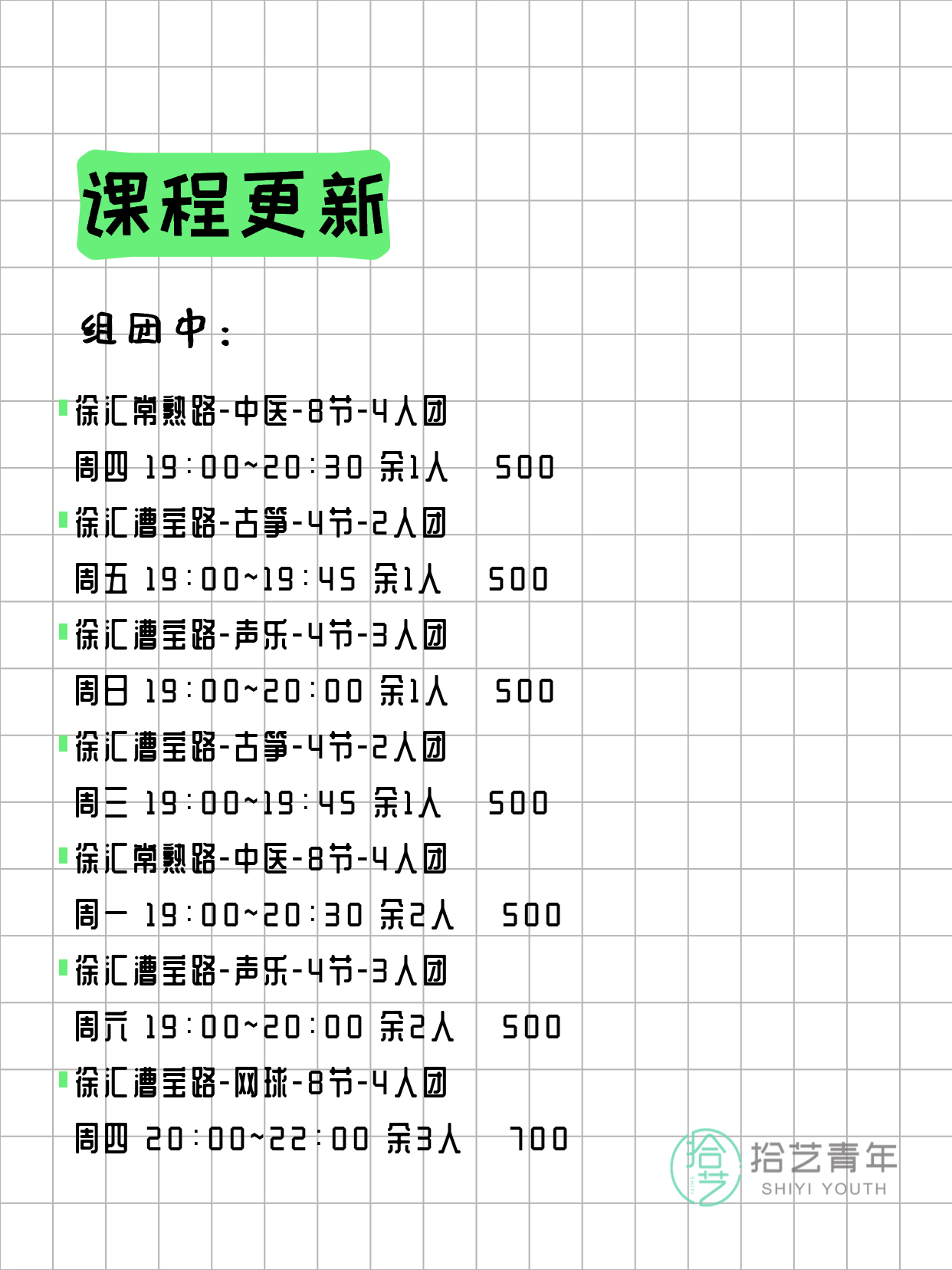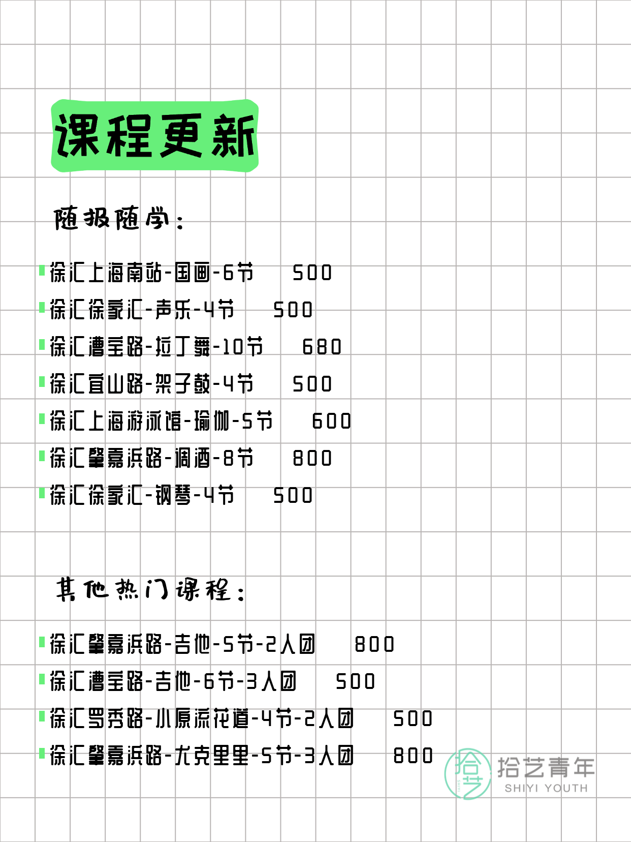 💡 提示:以上课程信息来自拾艺青年小程序,课程可能随报名动态变化,具体以小程序实时信息为准。