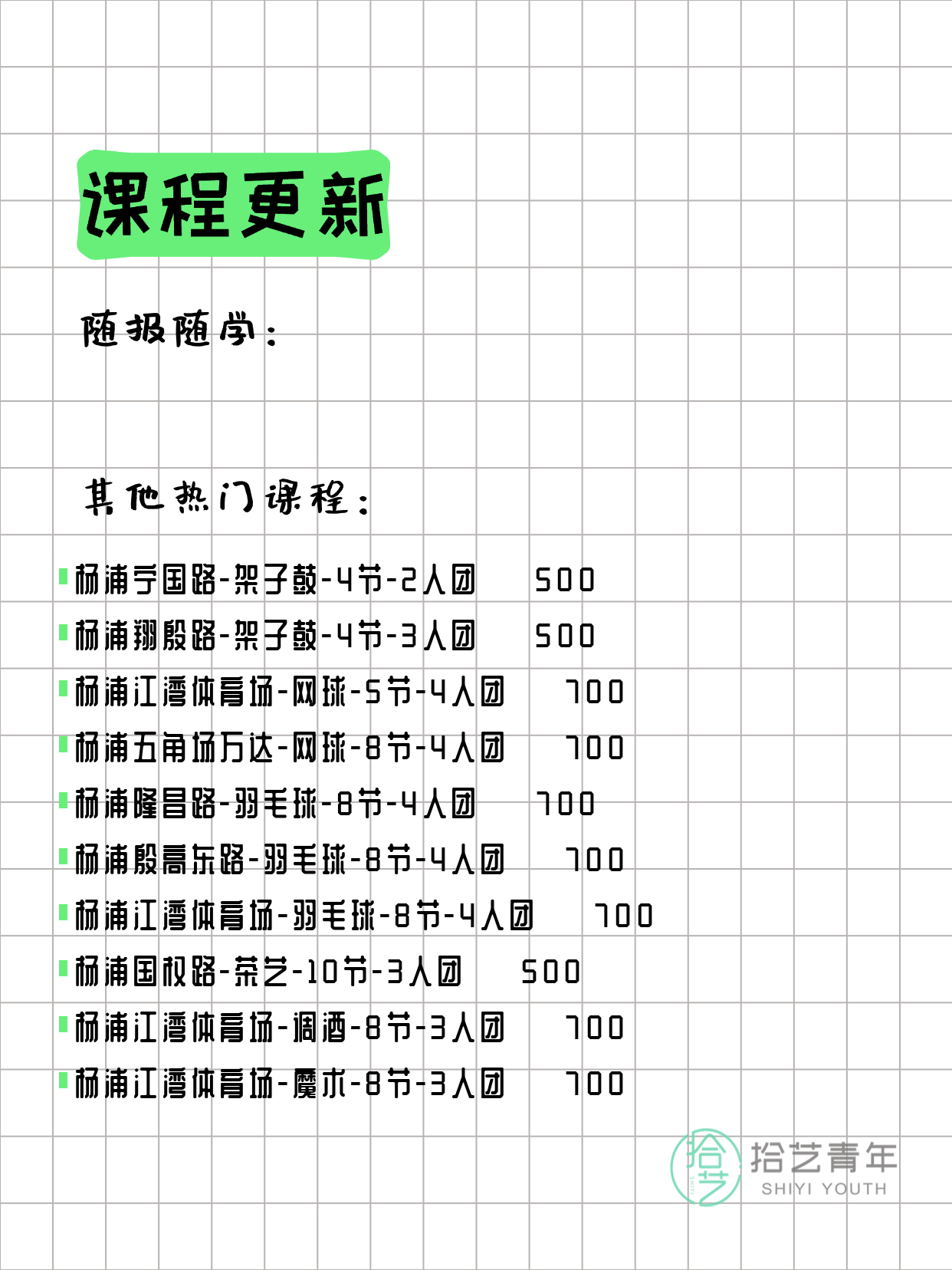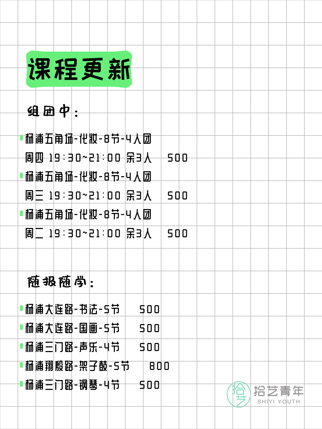 💡 提示:以上课程信息来自拾艺青年小程序,课程可能随报名动态变化,具体以小程序实时信息为准。