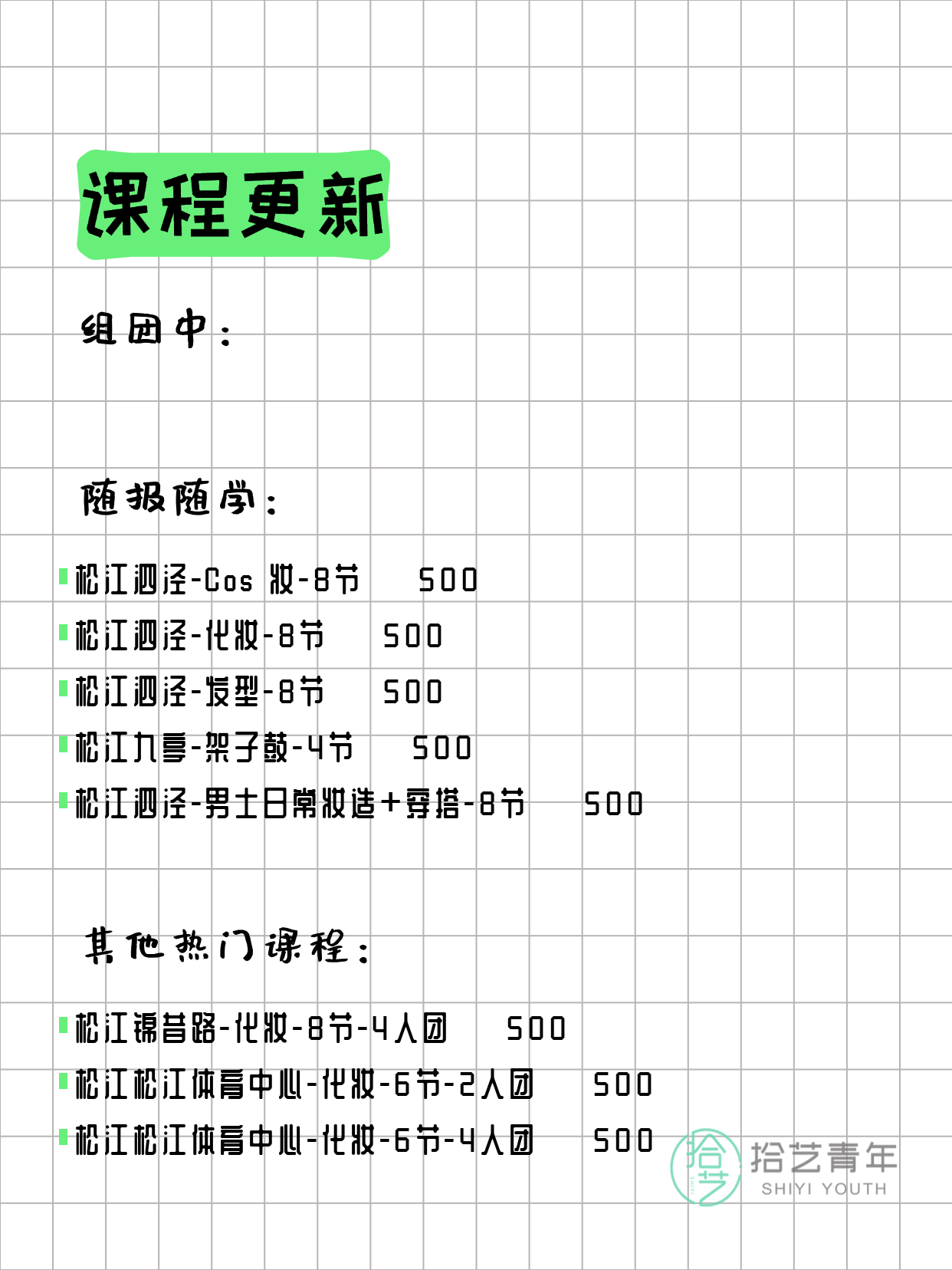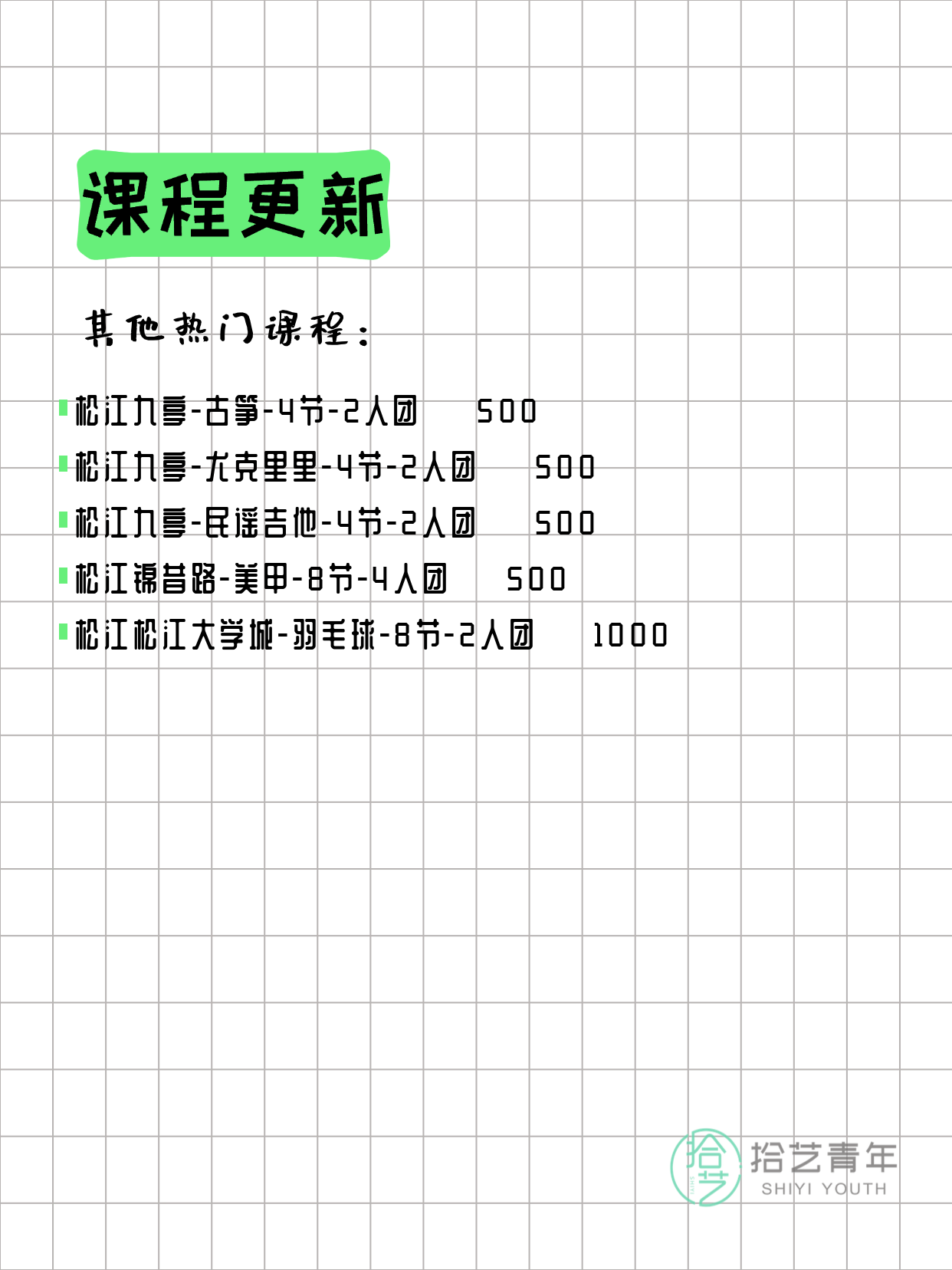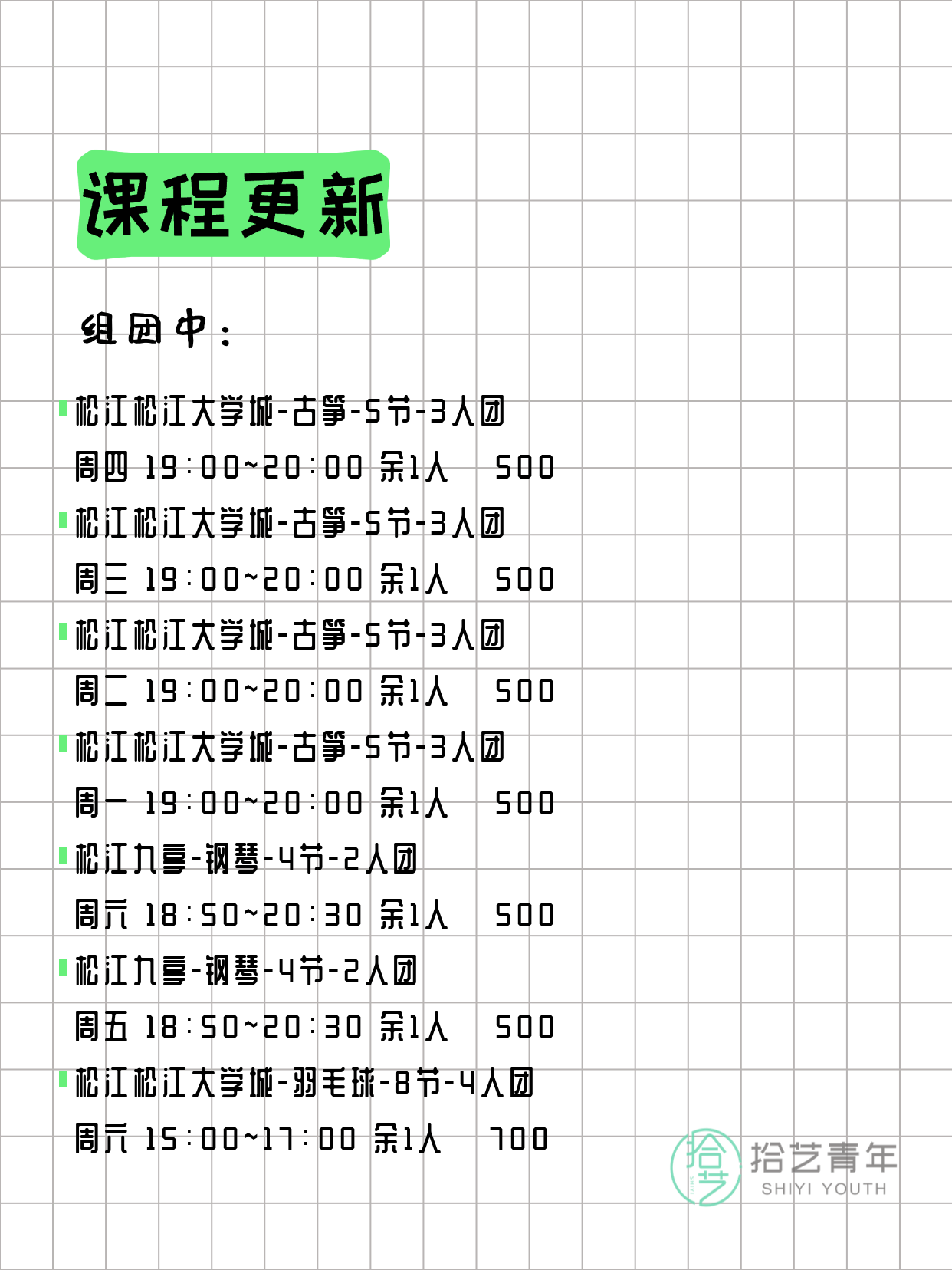 💡 提示:以上课程信息来自拾艺青年小程序,课程可能随报名动态变化,具体以小程序实时信息为准。