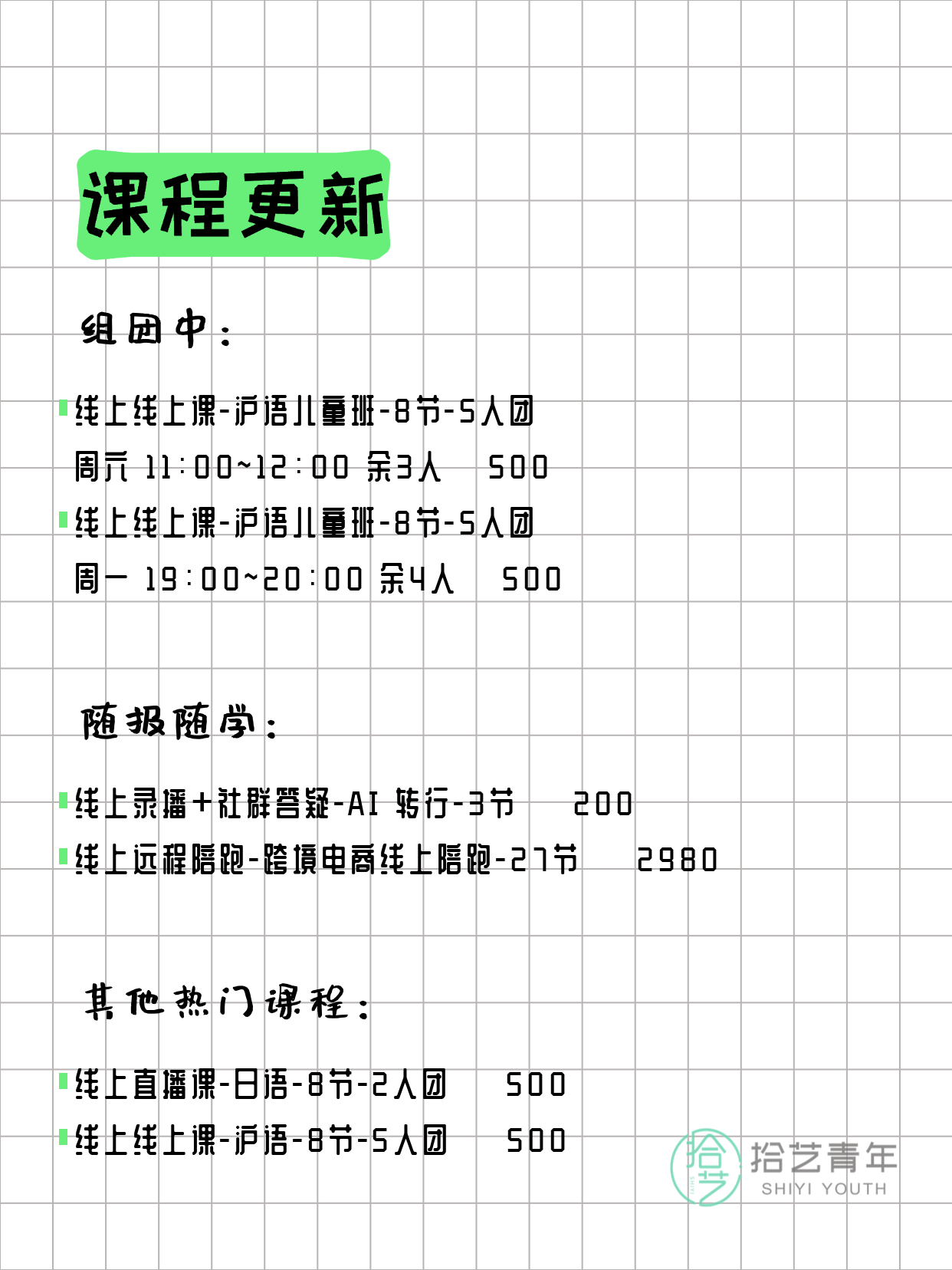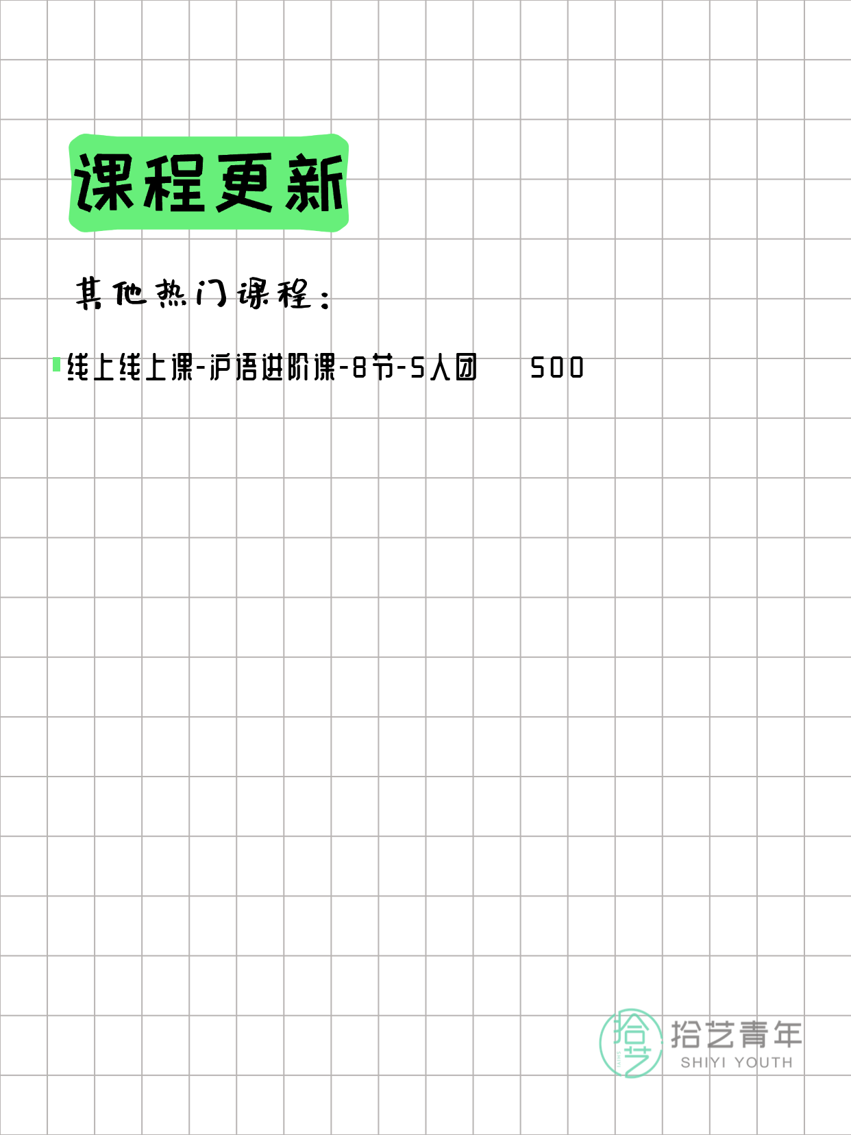 💡 提示:以上课程信息来自拾艺青年小程序,课程可能随报名动态变化,具体以小程序实时信息为准。