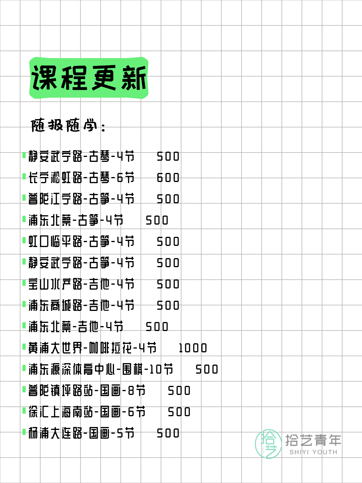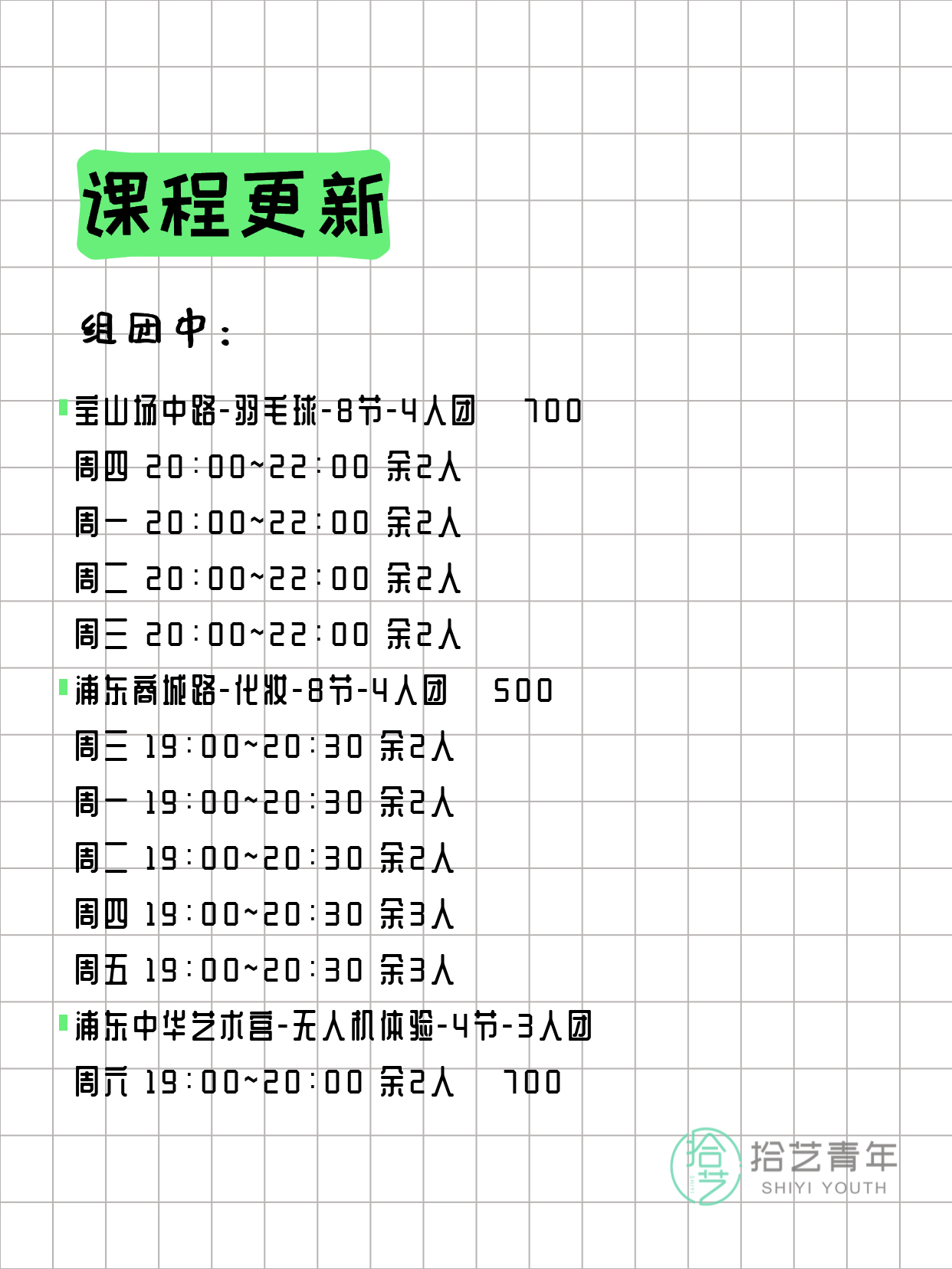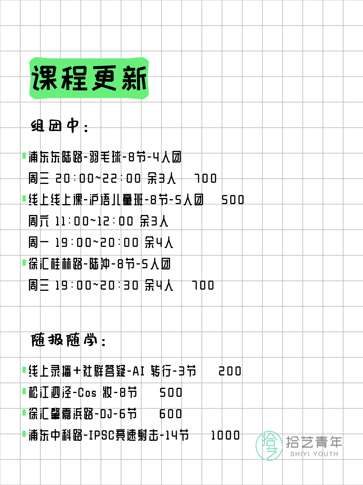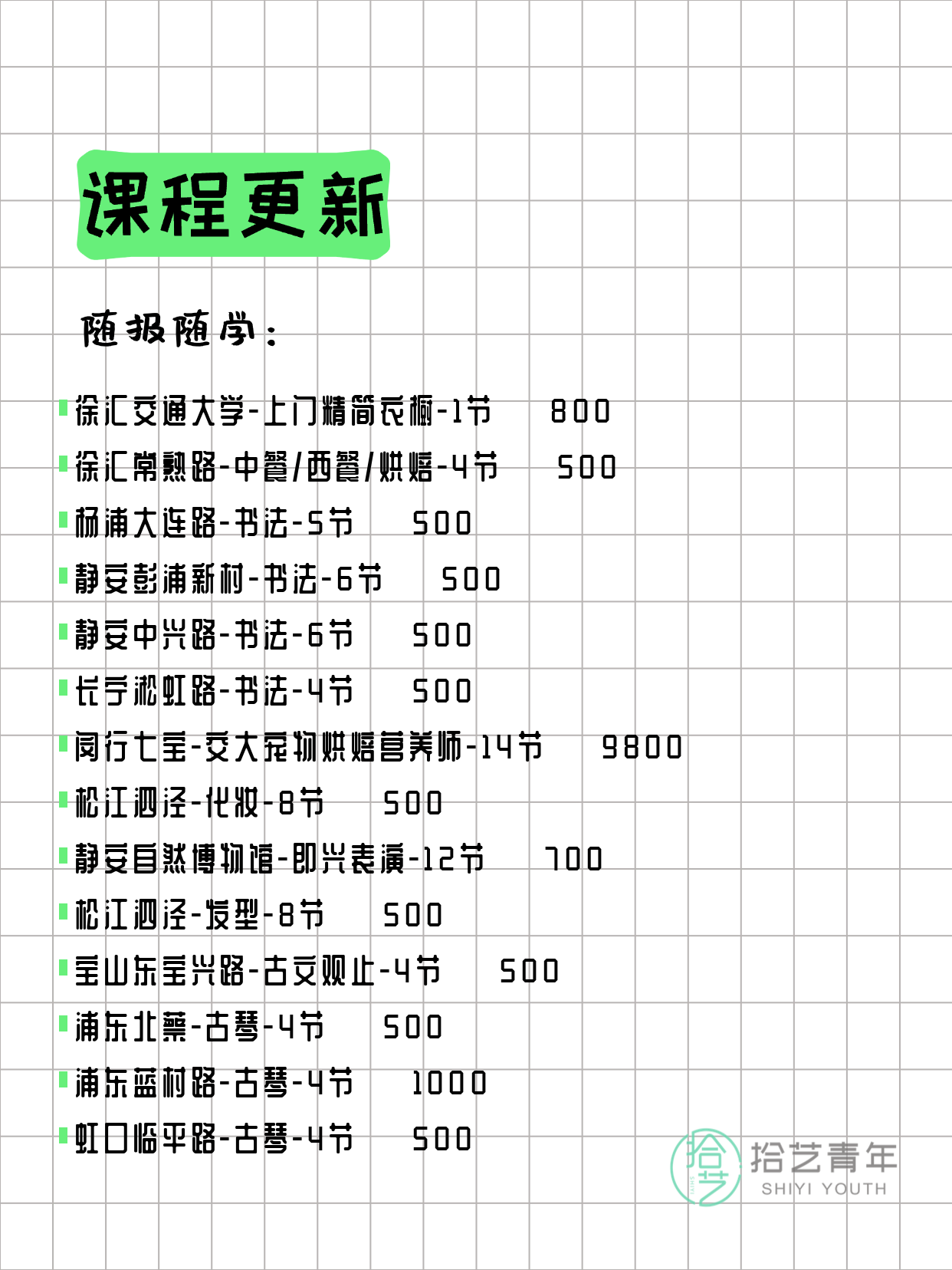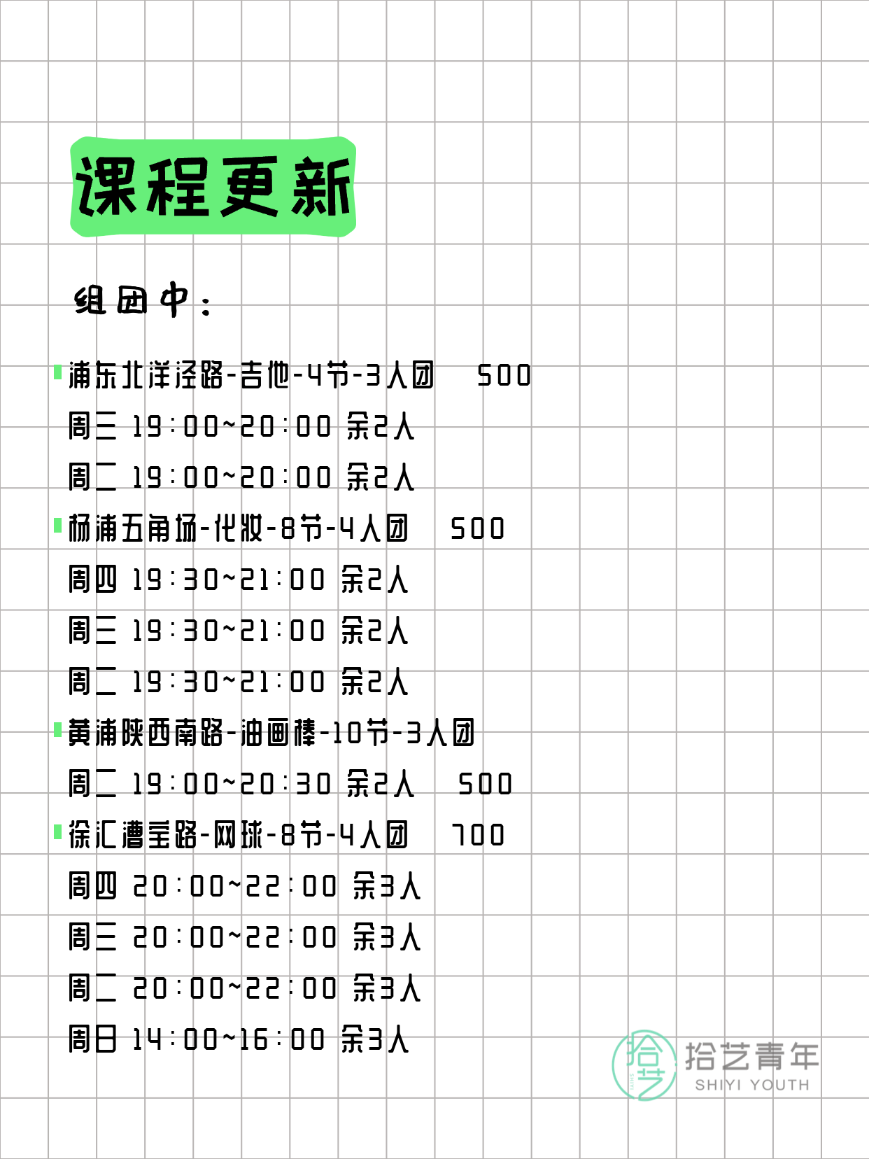 💡 提示:以上课程信息来自拾艺青年小程序,课程可能随报名动态变化,具体以小程序实时信息为准。