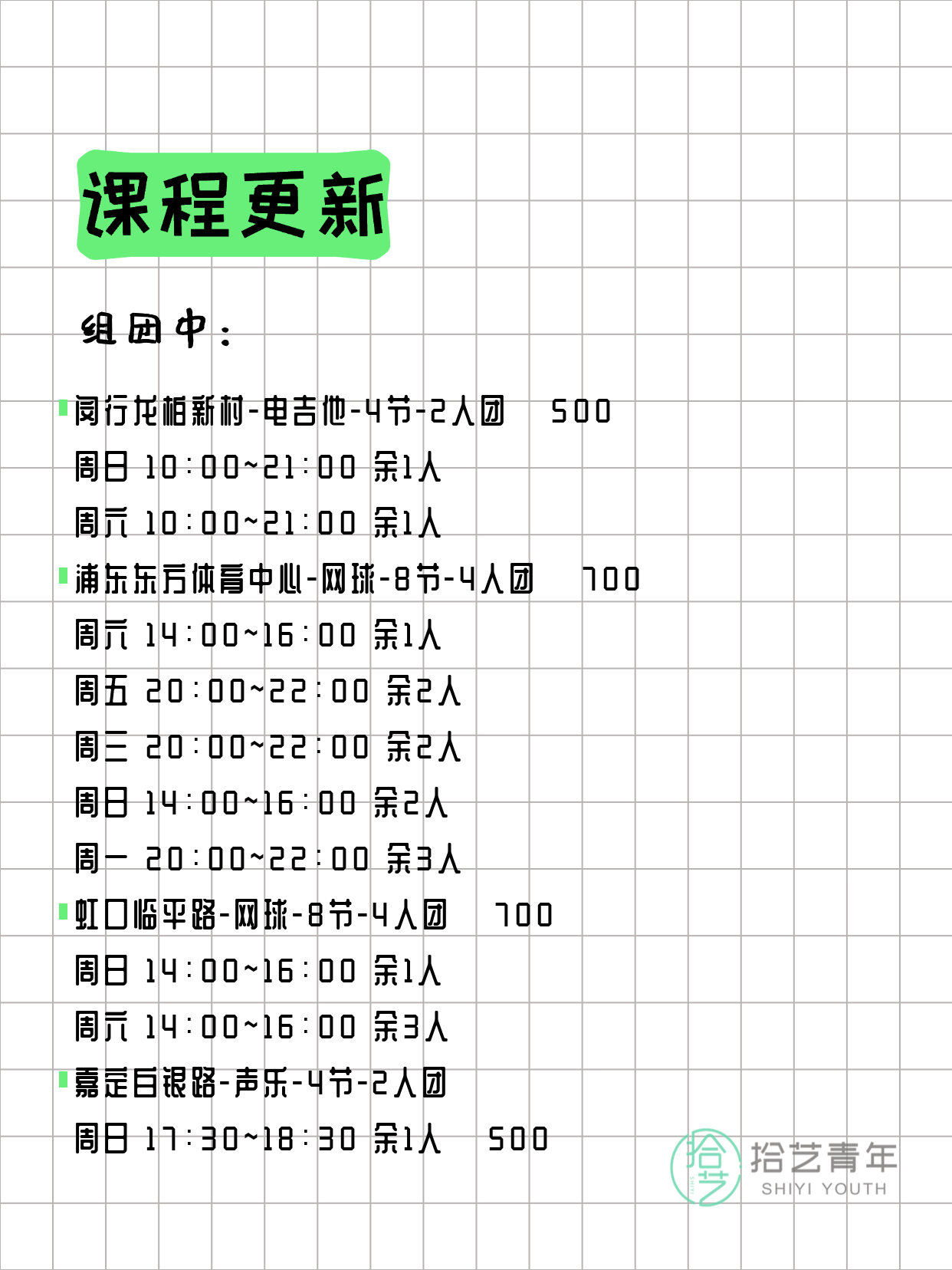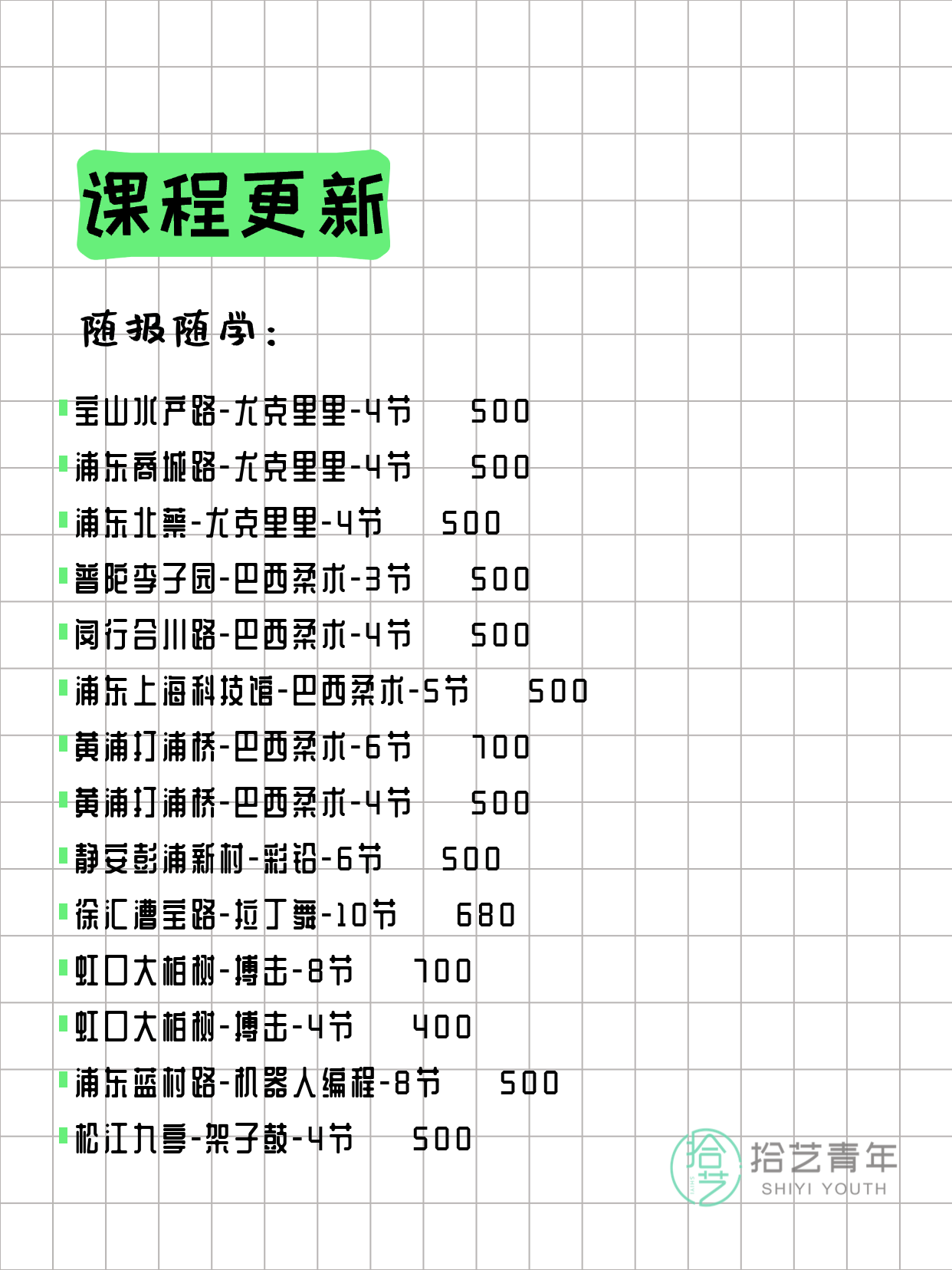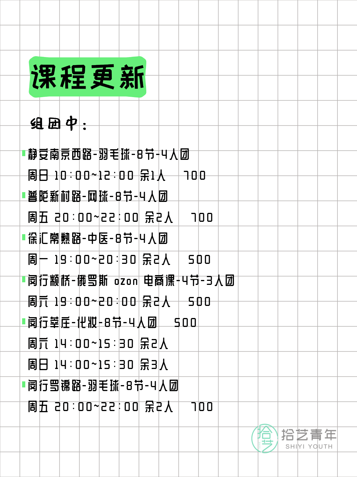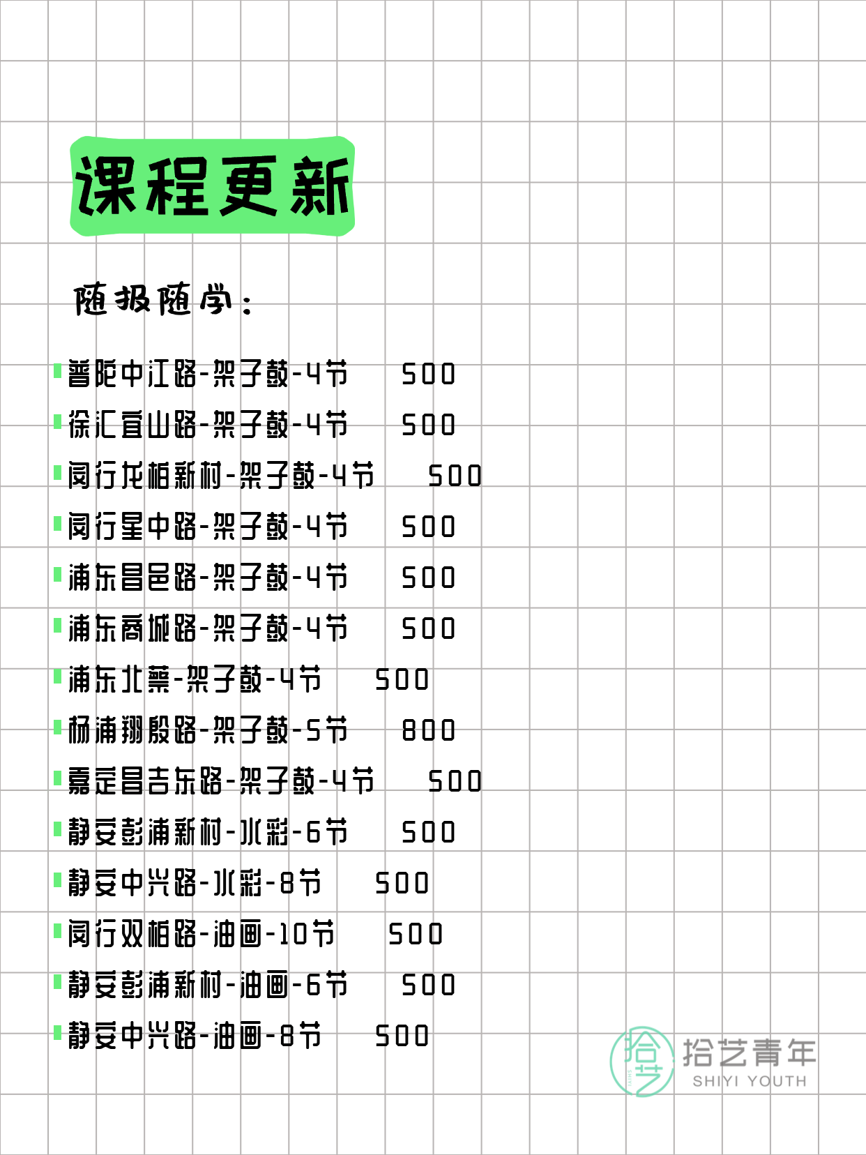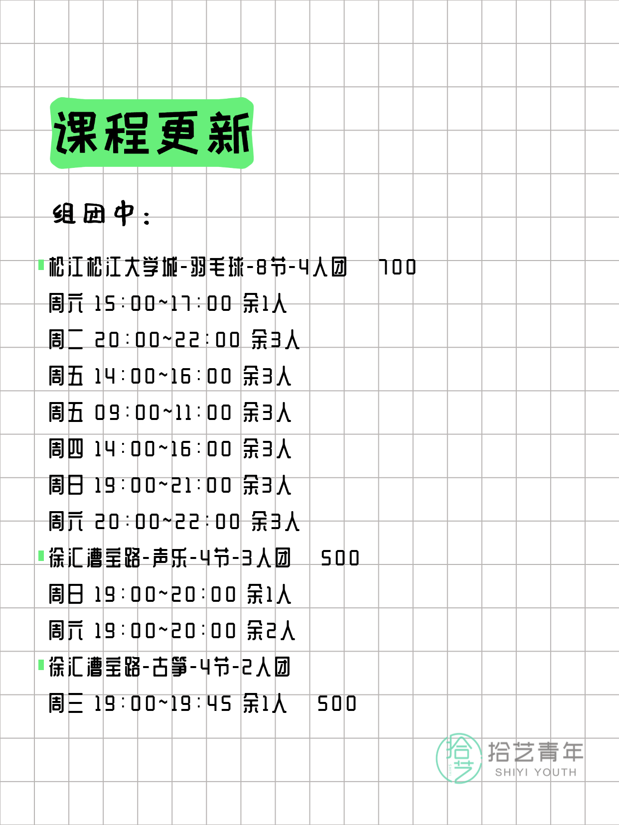 💡 提示:以上课程信息来自拾艺青年小程序,课程可能随报名动态变化,具体以小程序实时信息为准。
