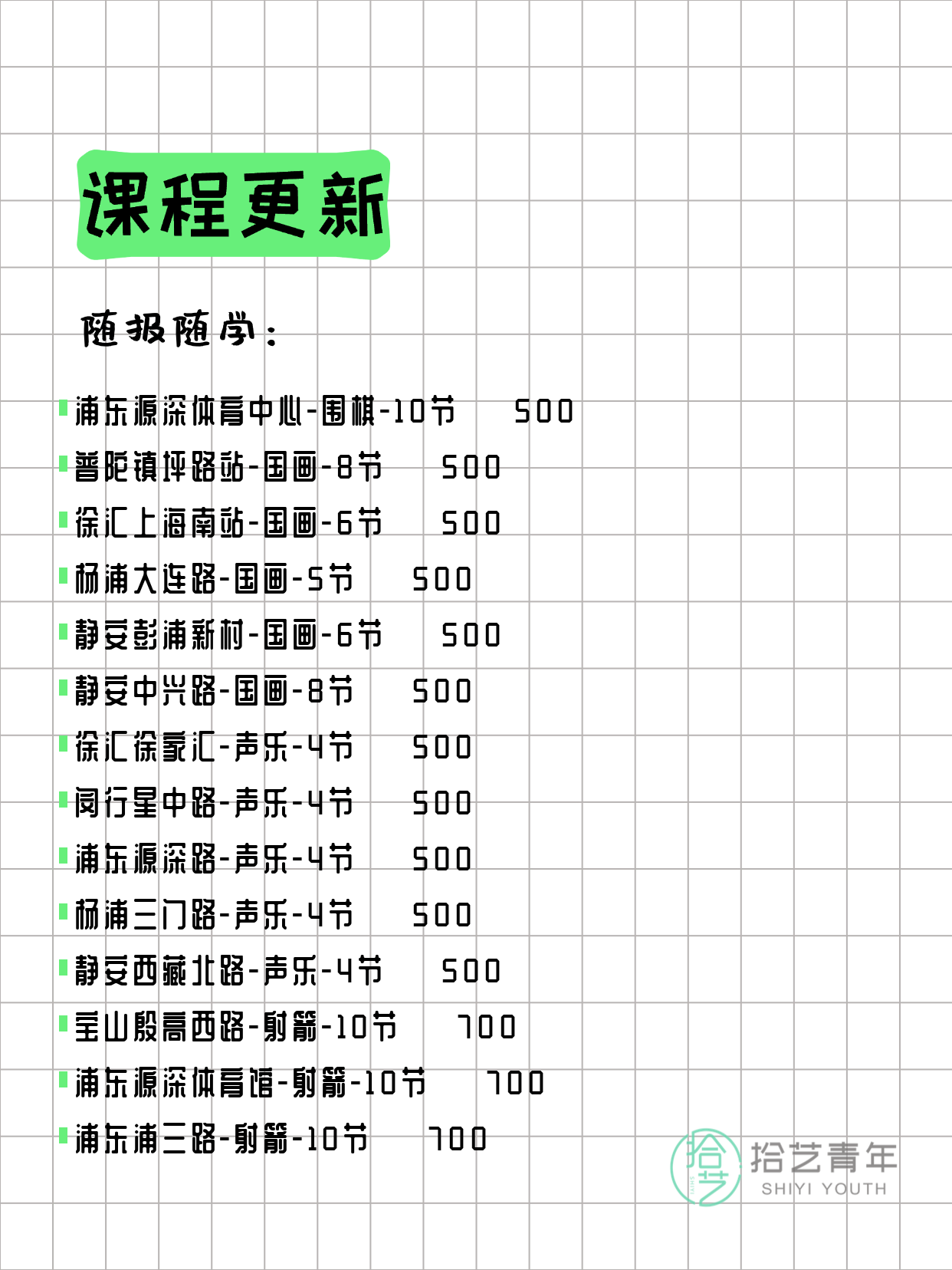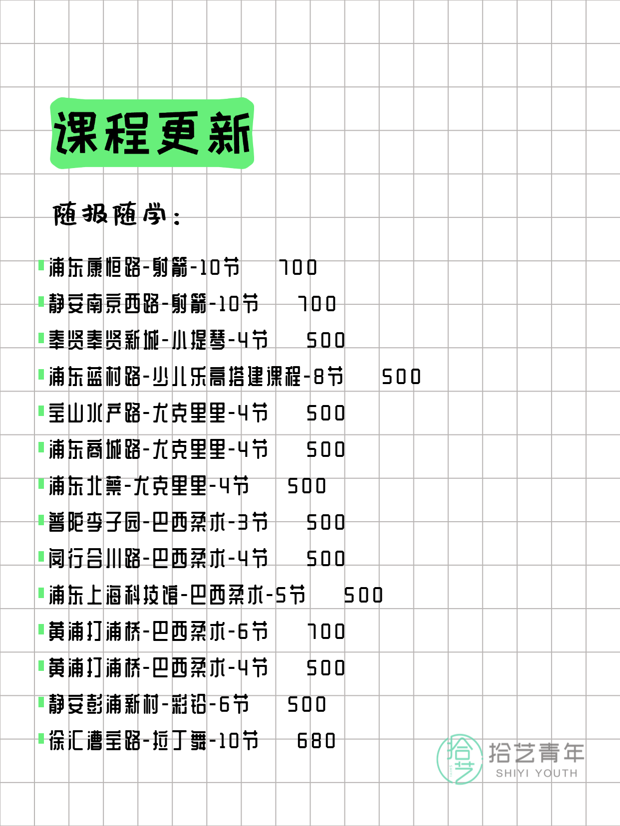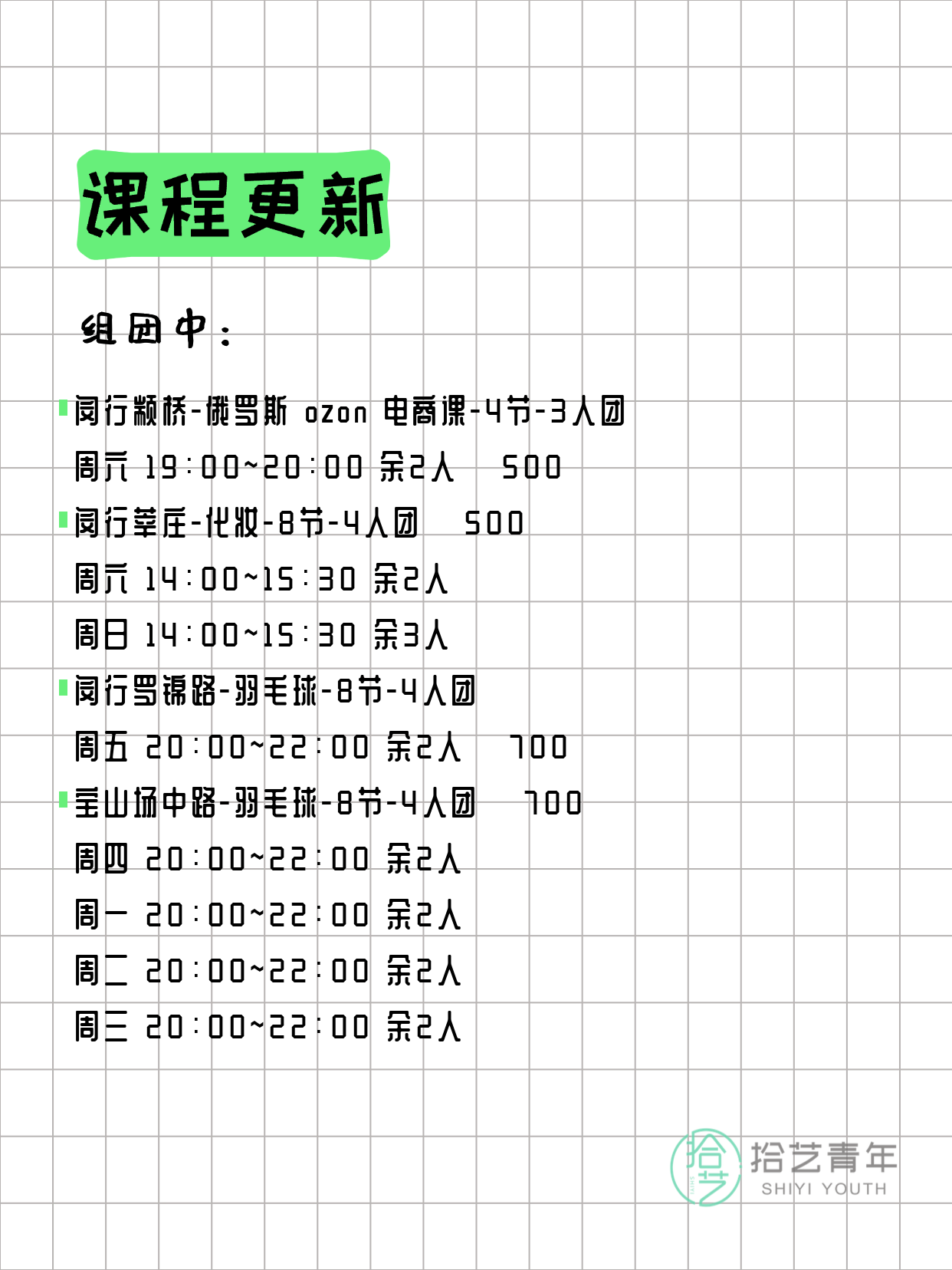 资讯>综合>正文3月15日上海夜校课程合集拾艺青年2026-03-151 / 17📊 本期课程概况• 总课程数:371门• 组团中课程:83门• 覆盖区域:15个区详见图片,欢迎报名咨询。💡 提示:以上课程信息来自拾艺青年小程序,课程可能随报名动态变化,具体以小程序实时信息为准。👉 微信小程序链接:#小程序://拾艺青年/WmfwH22mnQUxZwb