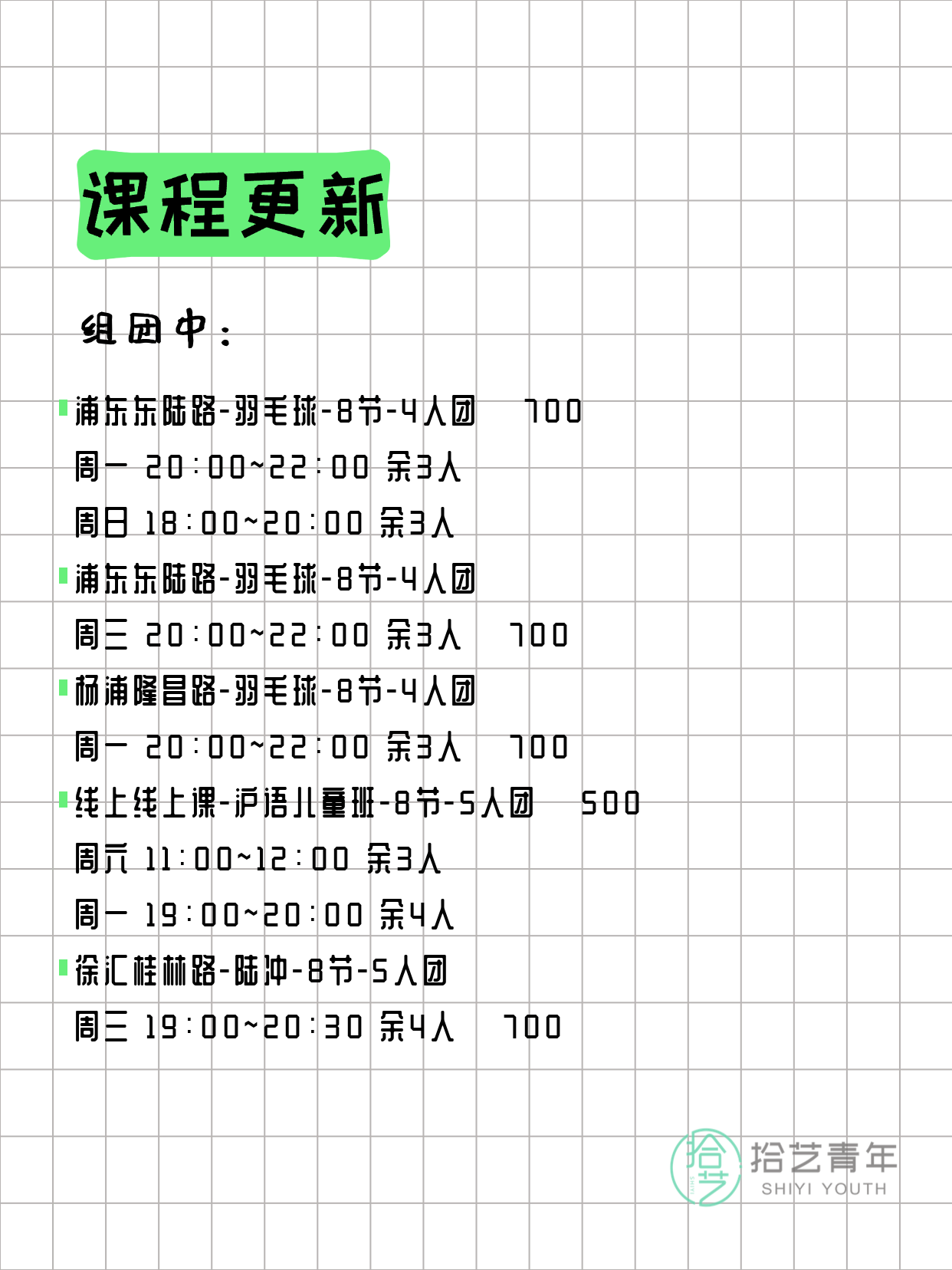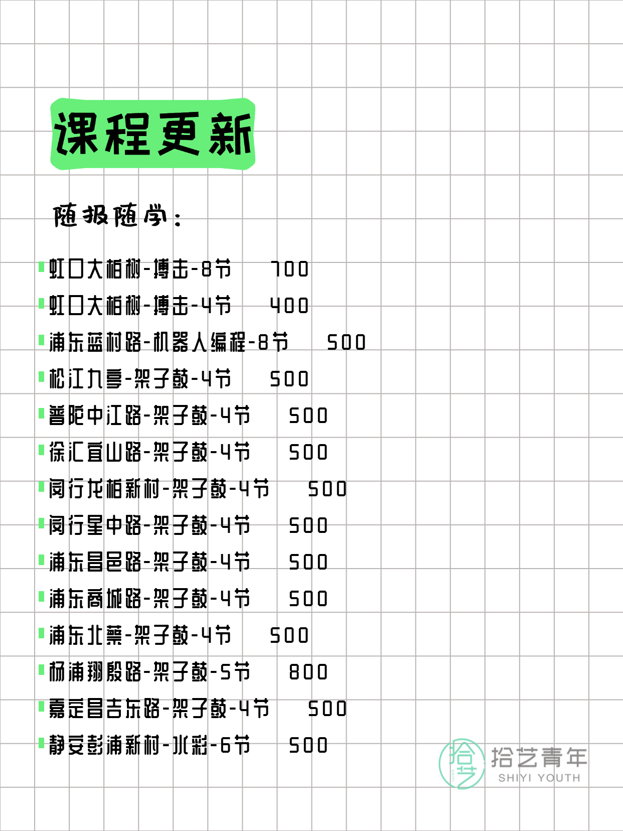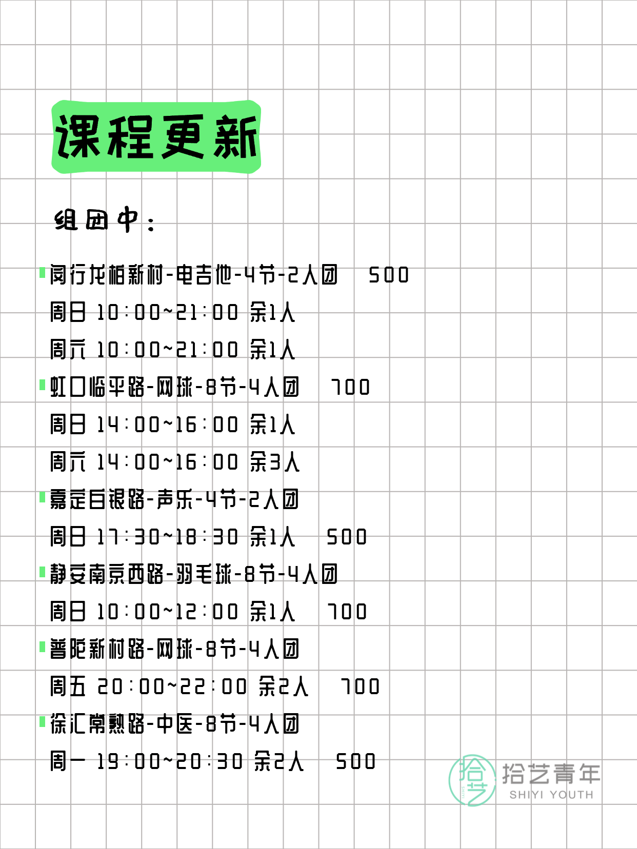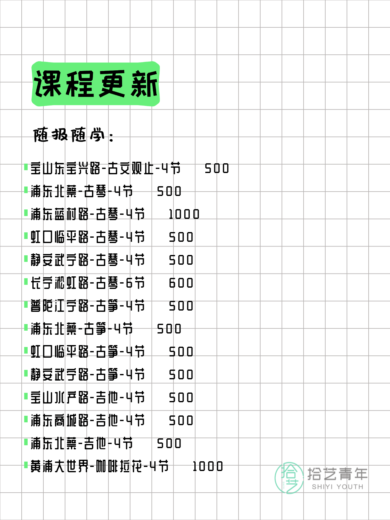 资讯>综合>正文3月15日上海夜校课程合集拾艺青年2026-03-151 / 17📊 本期课程概况• 总课程数:371门• 组团中课程:83门• 覆盖区域:15个区详见图片,欢迎报名咨询。💡 提示:以上课程信息来自拾艺青年小程序,课程可能随报名动态变化,具体以小程序实时信息为准。👉 微信小程序链接:#小程序://拾艺青年/WmfwH22mnQUxZwb