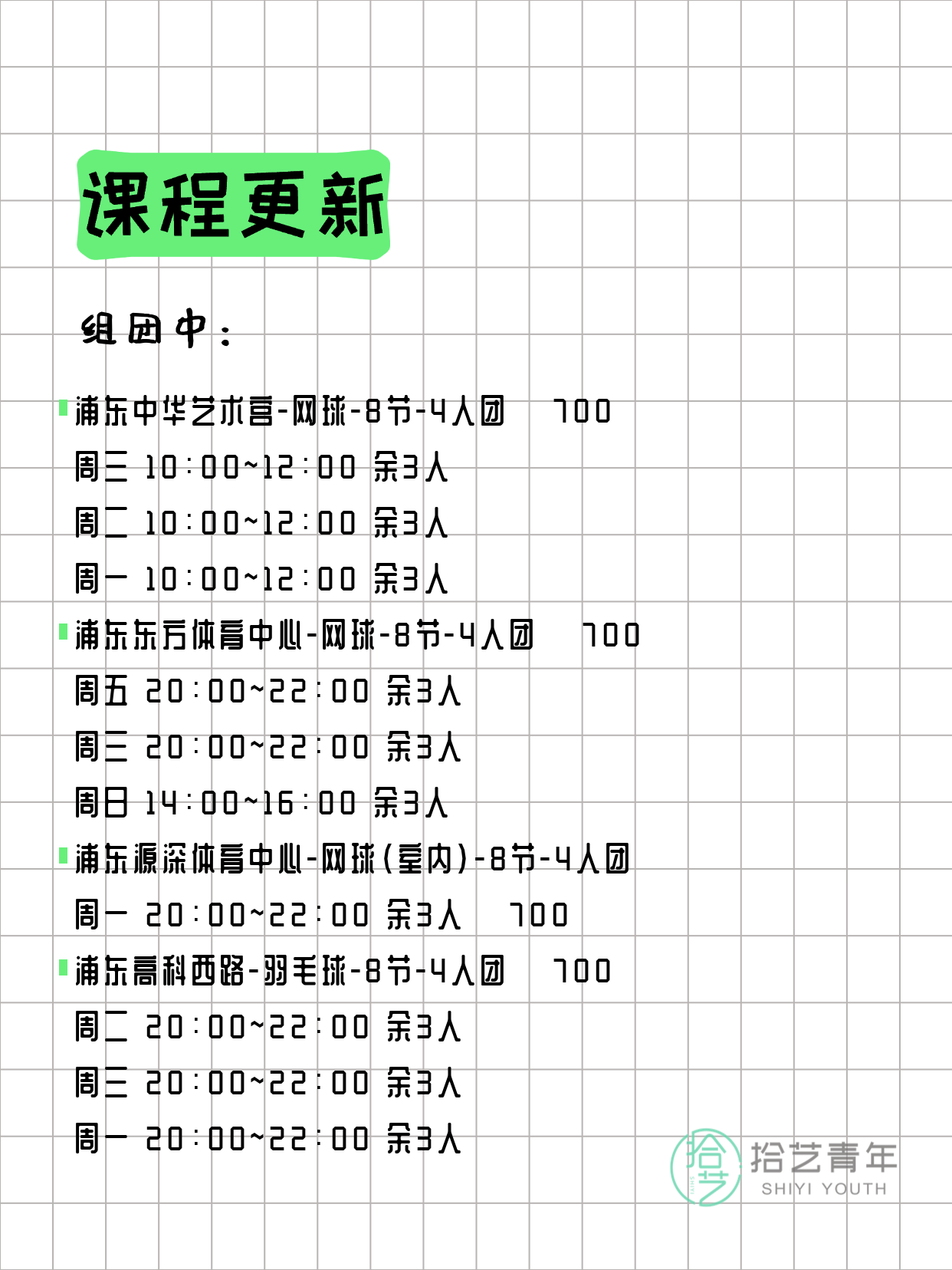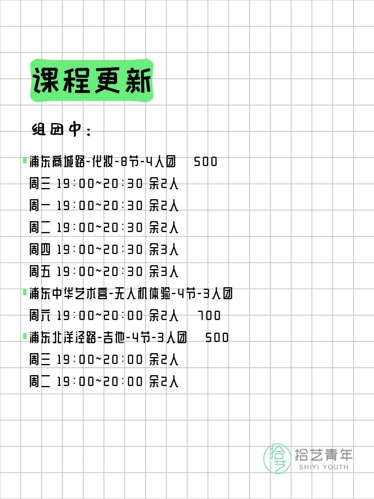 💡 提示:以上课程信息来自拾艺青年小程序,课程可能随报名动态变化,具体以小程序实时信息为准。