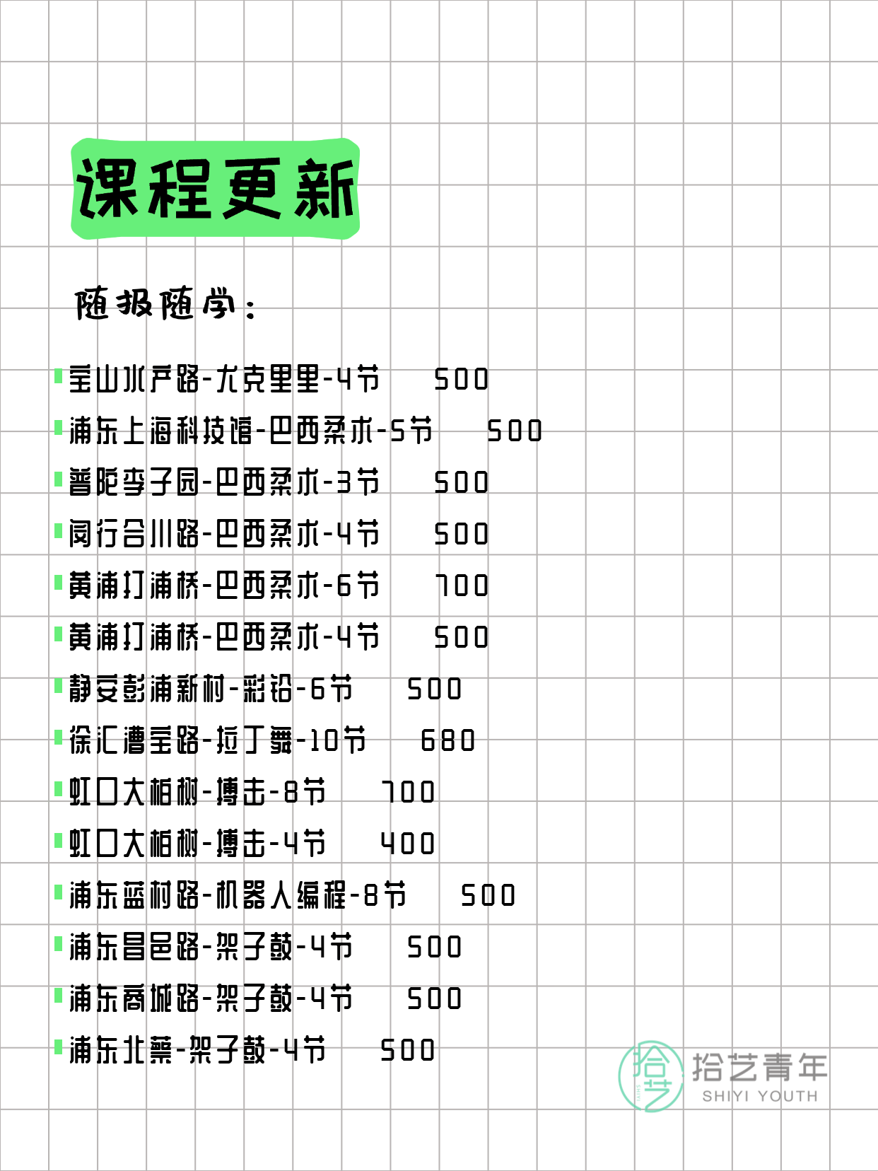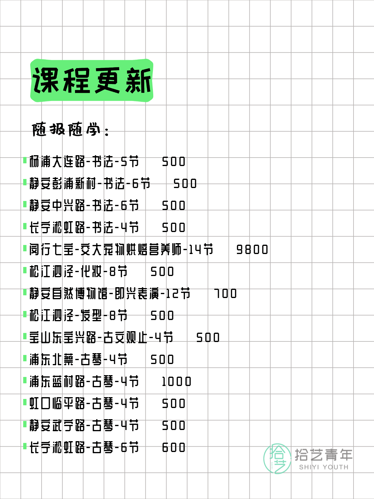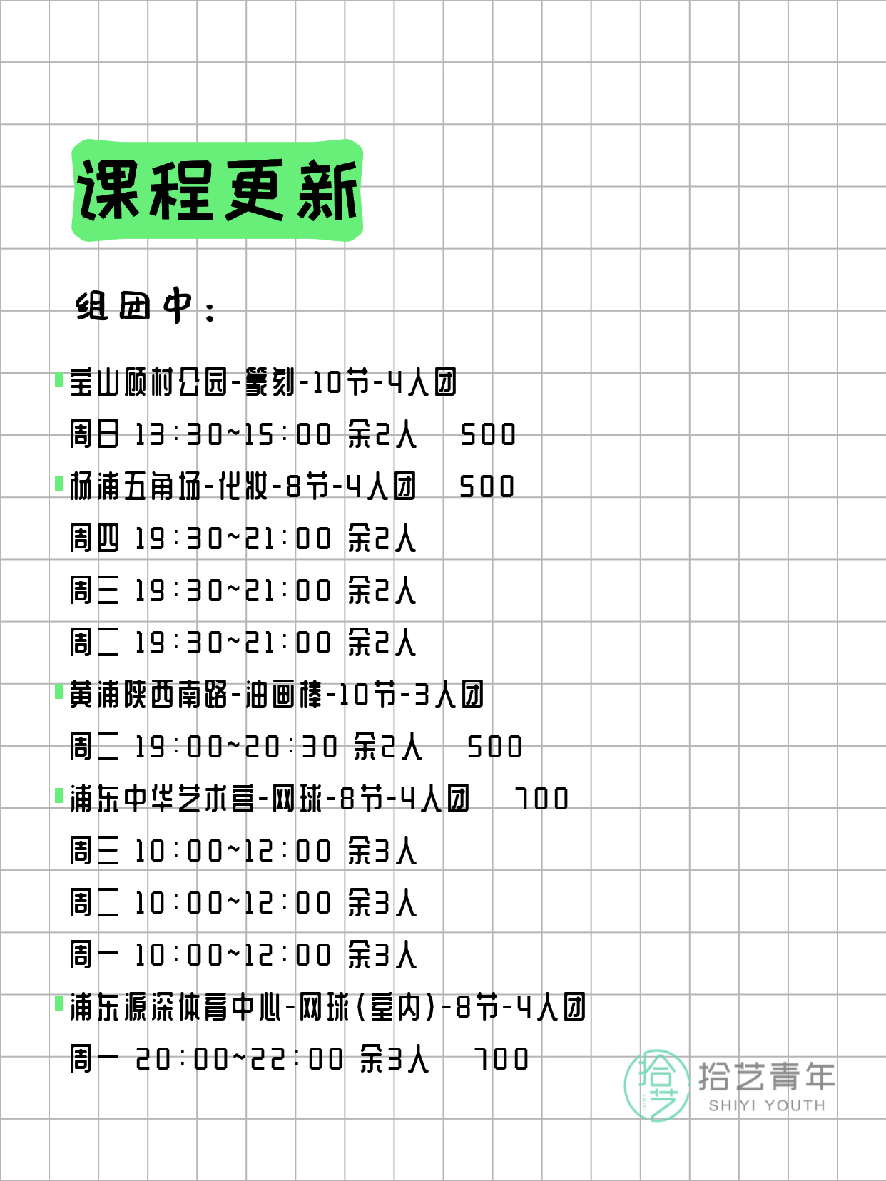 资讯>综合>正文3月15日上海夜校课程合集拾艺青年2026-03-151 / 17📊 本期课程概况• 总课程数:373门• 组团中课程:85门• 覆盖区域:15个区详见图片,欢迎报名咨询。💡 提示:以上课程信息来自拾艺青年小程序,课程可能随报名动态变化,具体以小程序实时信息为准。👉 微信小程序链接:#小程序://拾艺青年/WmfwH22mnQUxZwb