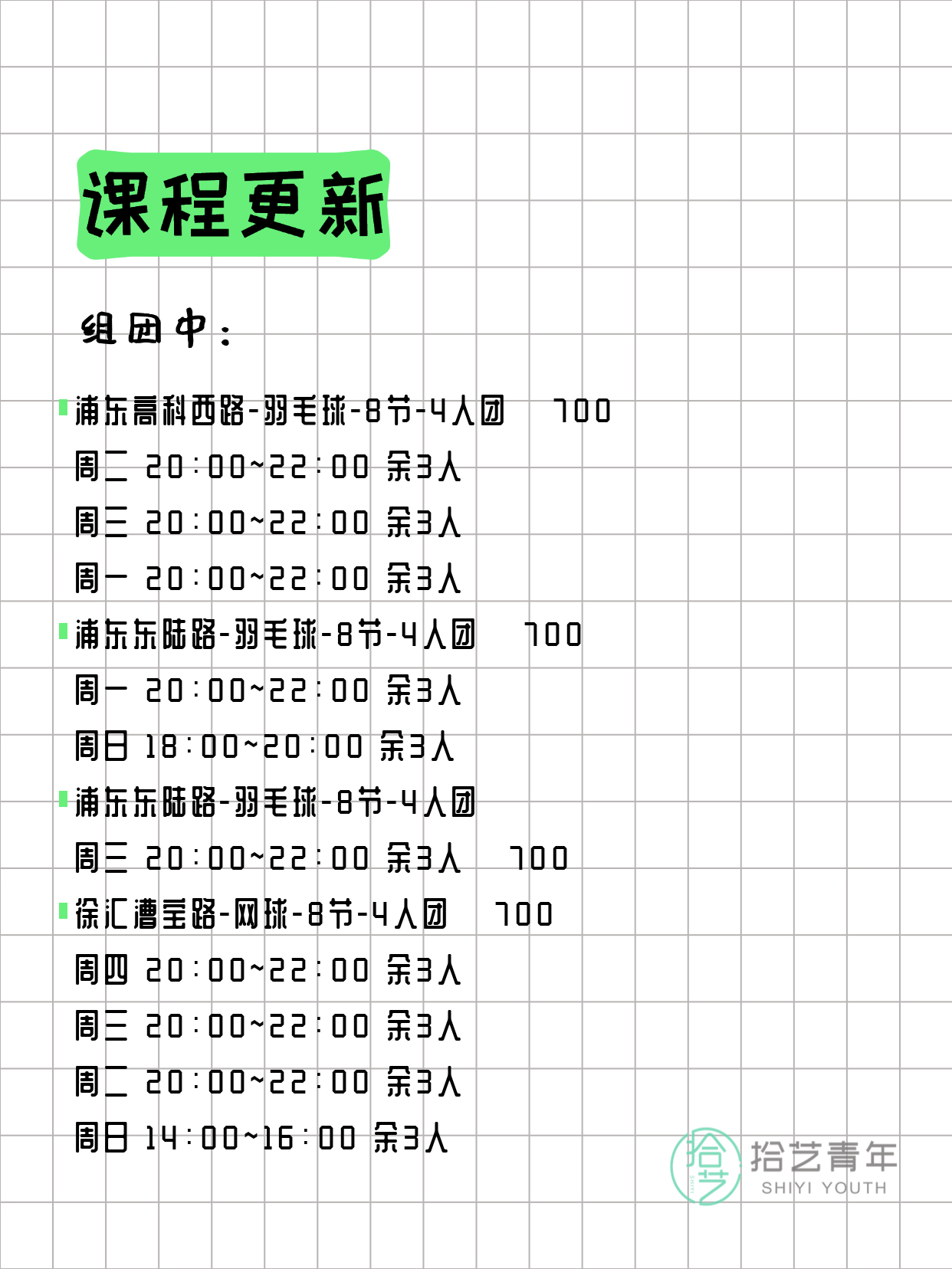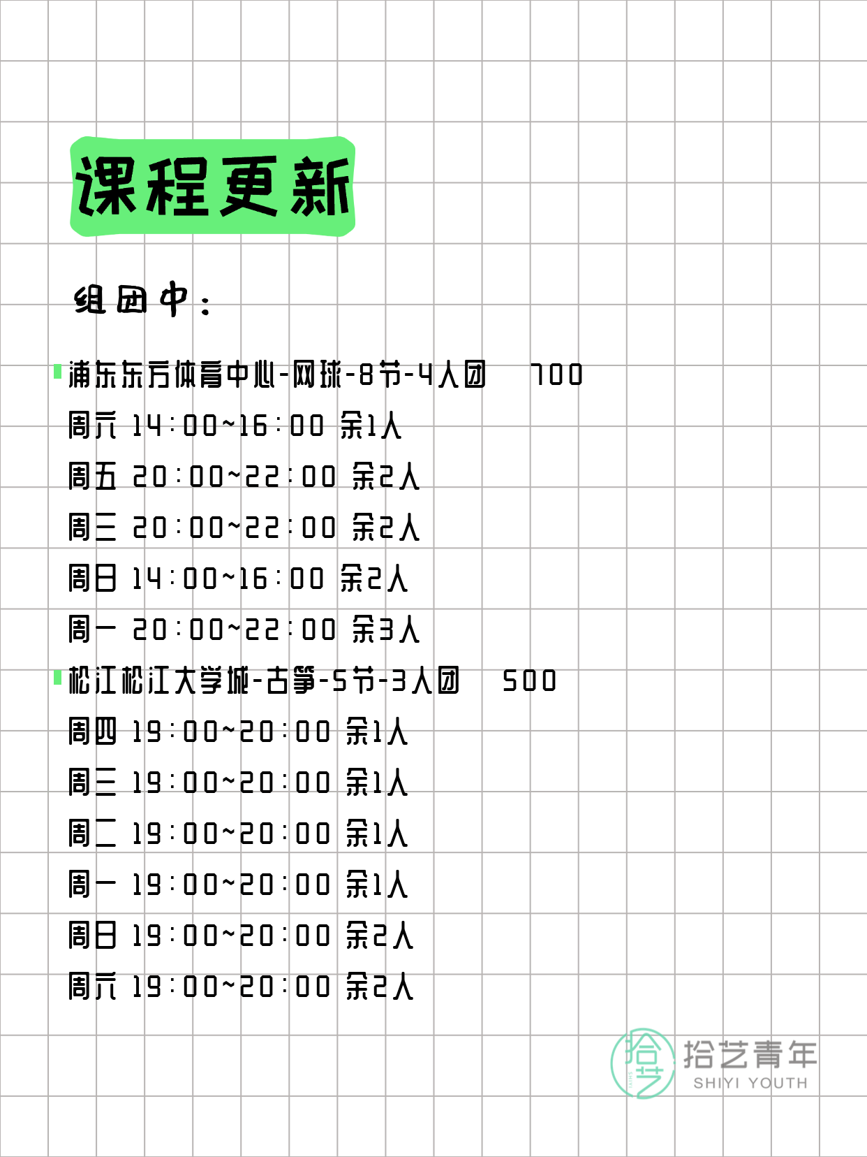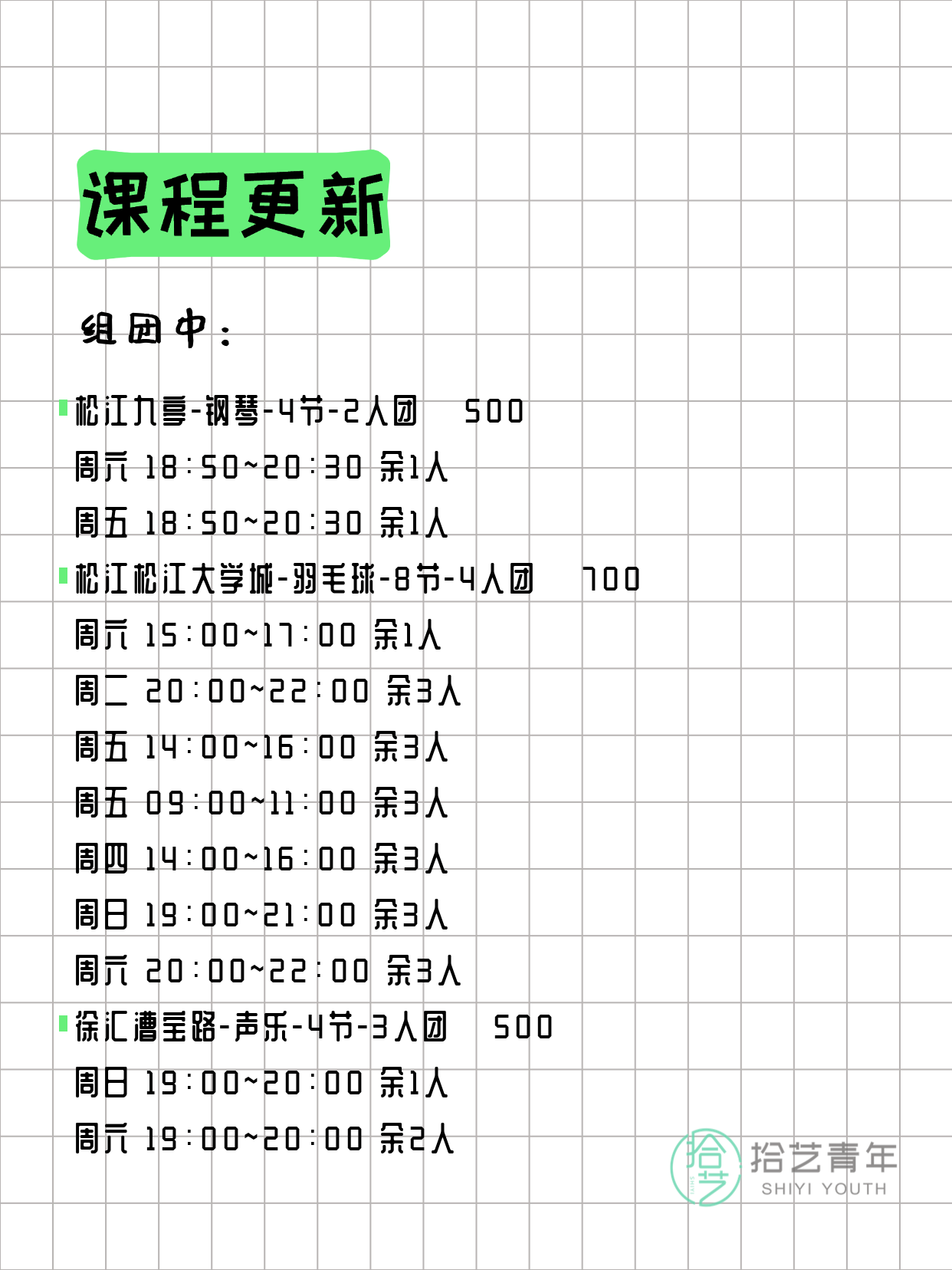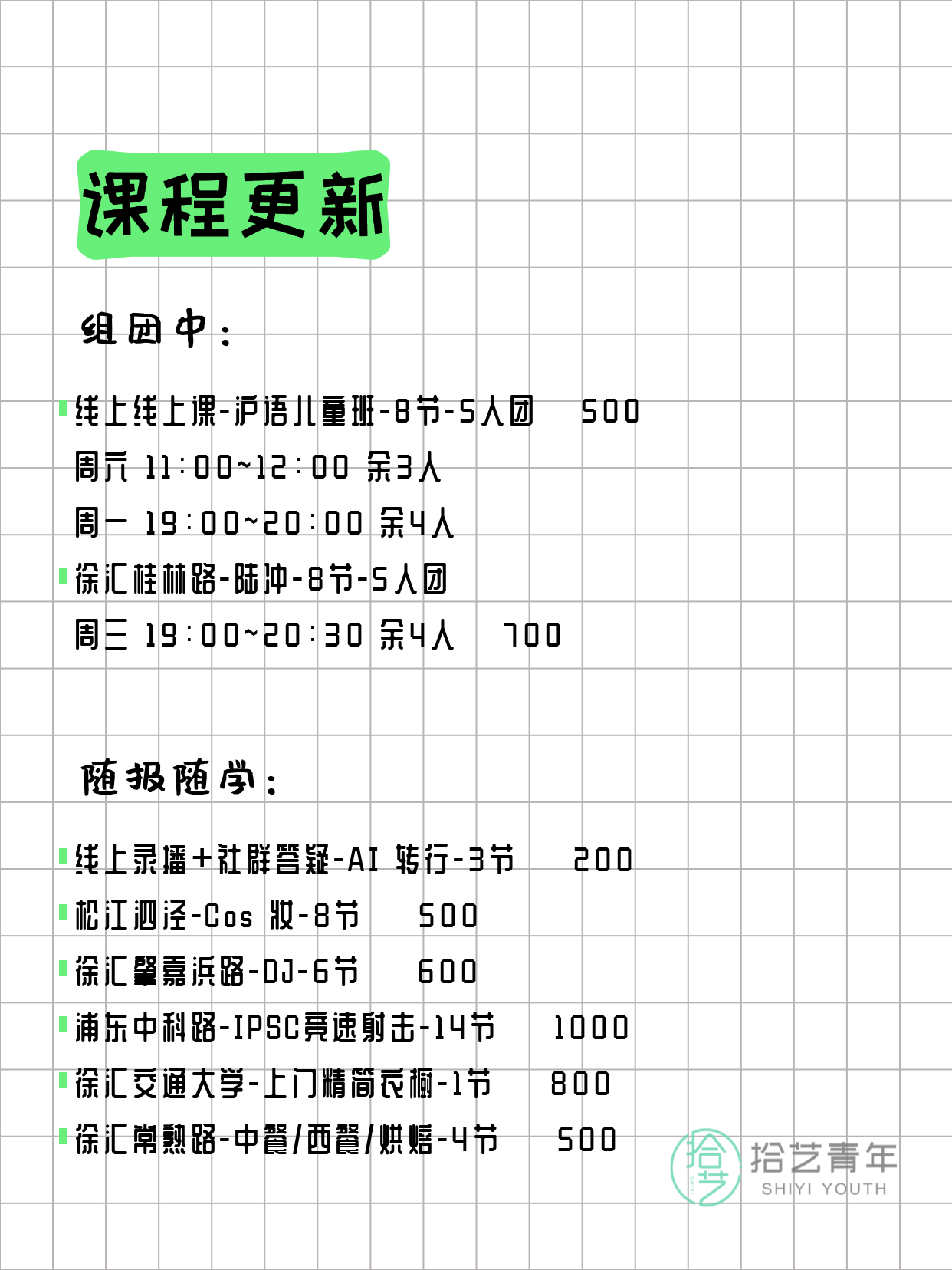 资讯>综合>正文3月15日上海夜校课程合集拾艺青年2026-03-151 / 17📊 本期课程概况• 总课程数:373门• 组团中课程:85门• 覆盖区域:15个区详见图片,欢迎报名咨询。💡 提示:以上课程信息来自拾艺青年小程序,课程可能随报名动态变化,具体以小程序实时信息为准。👉 微信小程序链接:#小程序://拾艺青年/WmfwH22mnQUxZwb