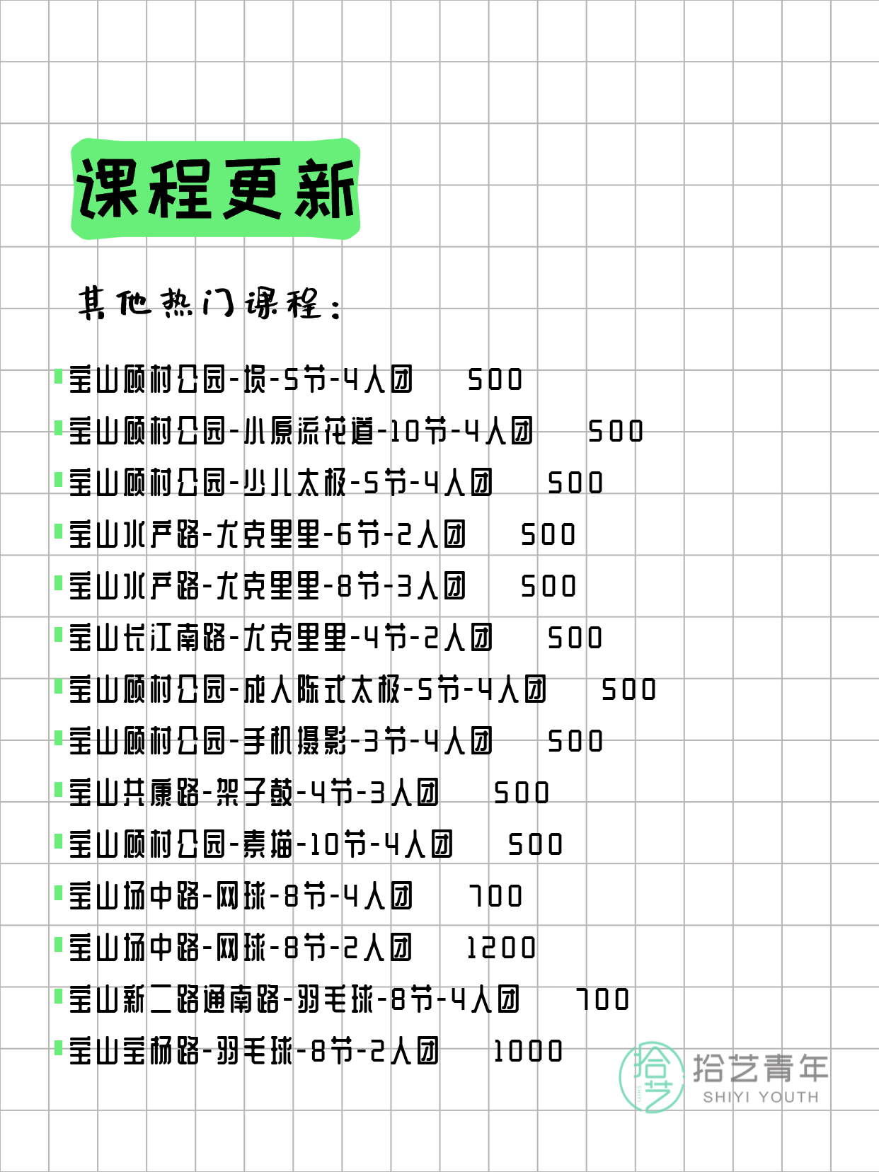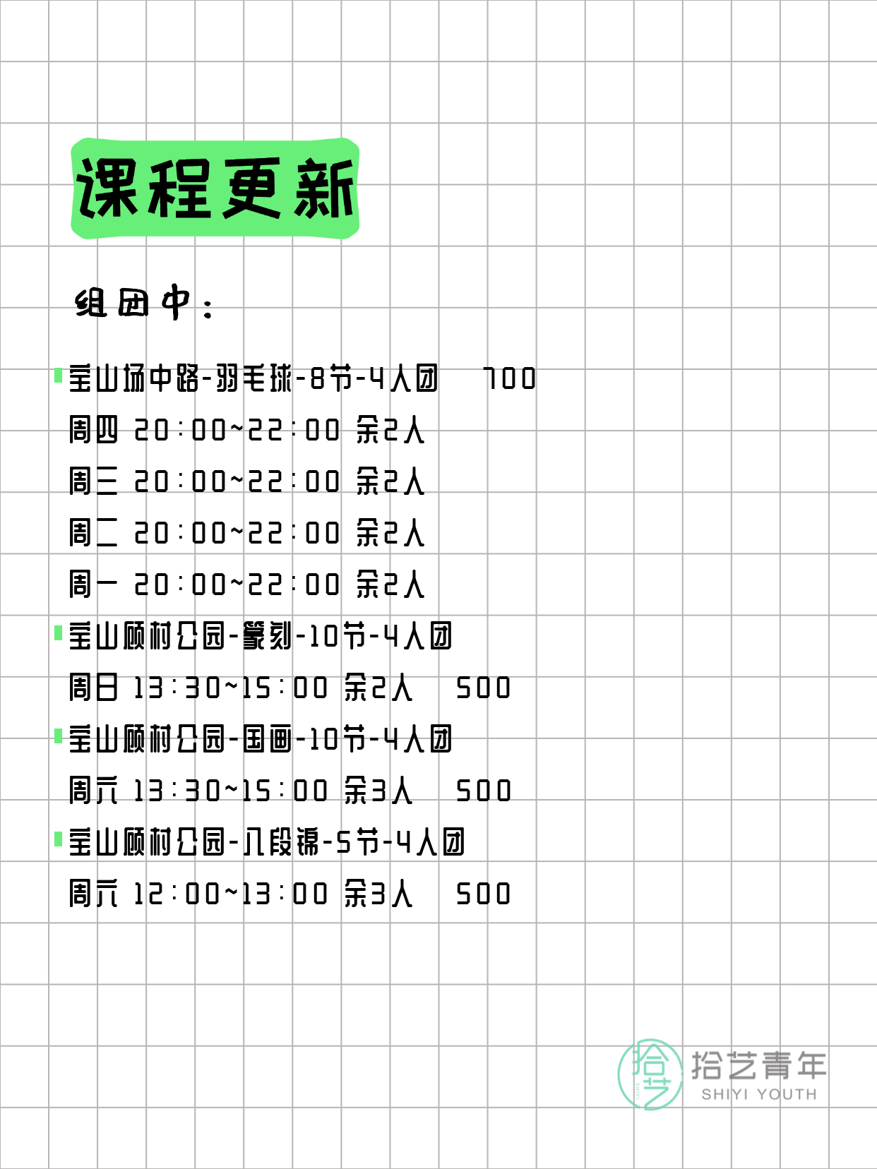 💡 提示:以上课程信息来自拾艺青年小程序,课程可能随报名动态变化,具体以小程序实时信息为准。