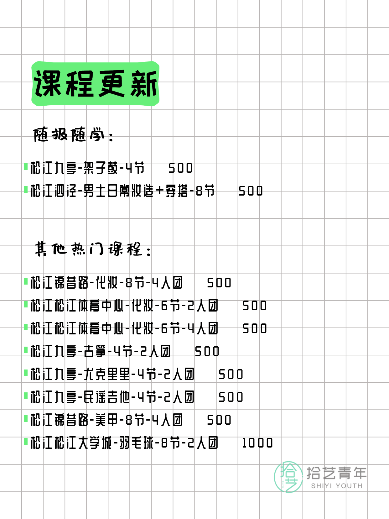 💡 提示:以上课程信息来自拾艺青年小程序,课程可能随报名动态变化,具体以小程序实时信息为准。