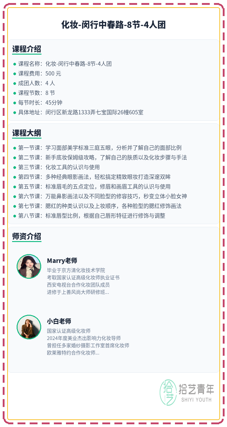 课程都是零基础教程,老师从底妆手法到眉眼修饰都教得很细,我这种手残党也能慢慢跟上。私教500元8节的价格很合适,时间灵活,偶尔加班调整上课时间也很方便,不会因为一次错过就跟不上进度。