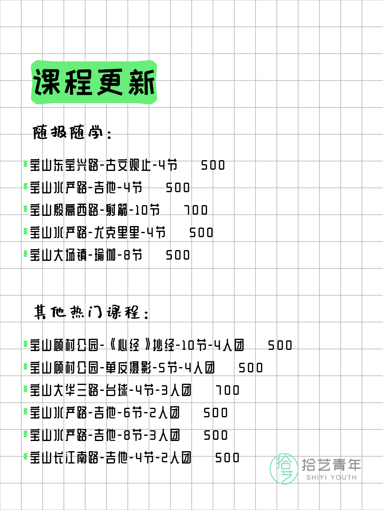💡 提示:以上课程信息来自拾艺青年小程序,课程可能随报名动态变化,具体以小程序实时信息为准。