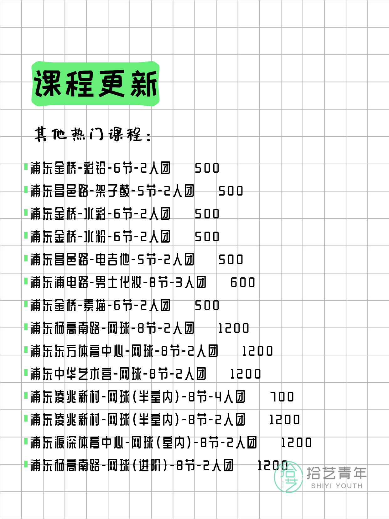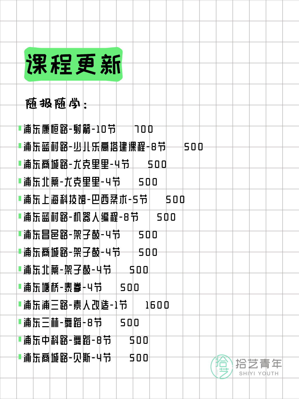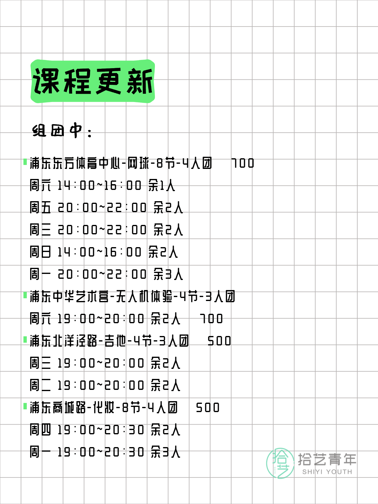 💡 提示:以上课程信息来自拾艺青年小程序,课程可能随报名动态变化,具体以小程序实时信息为准。