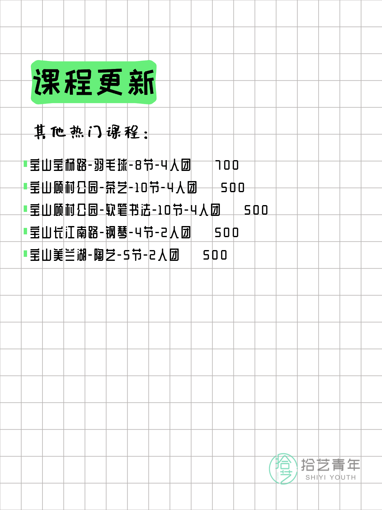 💡 提示:以上课程信息来自拾艺青年小程序,课程可能随报名动态变化,具体以小程序实时信息为准。